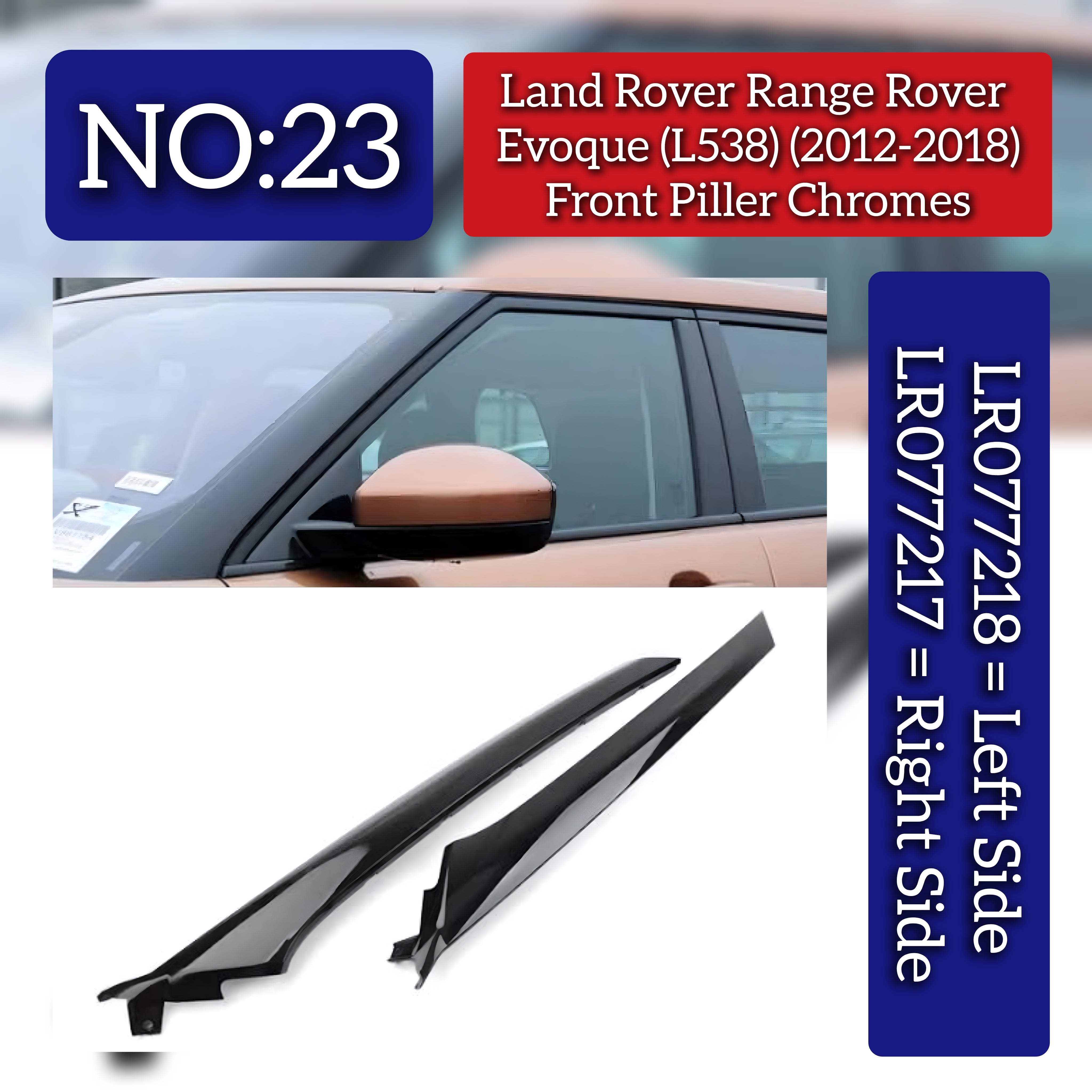 The Front Pillar Chrome set, comprising Left LR077218 and Right LR077217, is designed specifically for the Land Rover Range Rover Evoque L538 model years 2012 to 2018. These chrome pillars provide a precise fit, enhancing the vehicle's exterior with a polished finish while maintaining OEM standards. Ideal for restoring or upgrading your Evoque’s appearance, this set combines durability and style tailored for your vehicle.