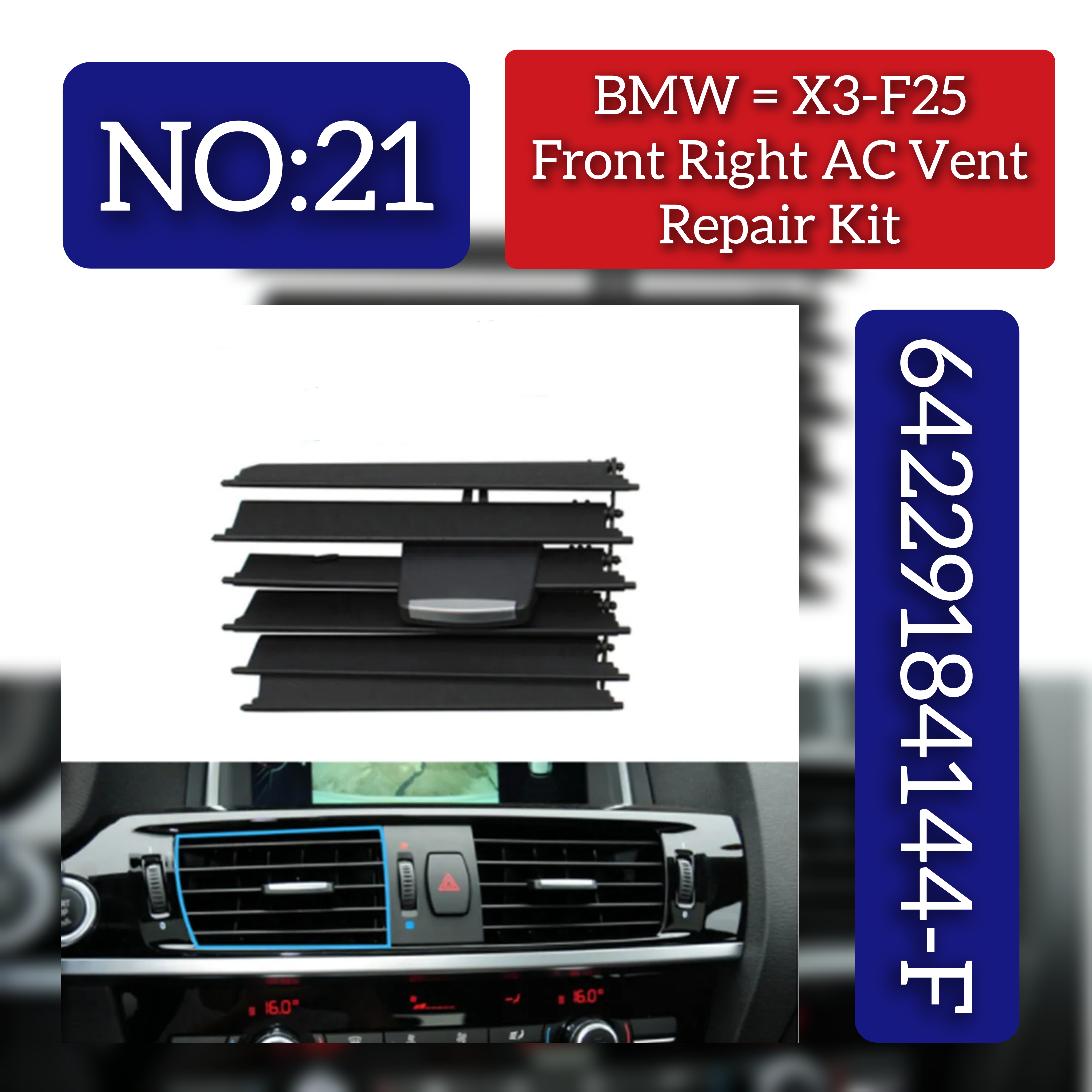 The Front Right AC Conditioner Air Vent Grill Outlet Tab Clip Repair Kit is specifically designed for BMW X3 F25 models. It ensures a secure and stable fit for your AC vents, increasing the overall performance and efficiency of your vehicle's air conditioning system. Made with high-quality materials, this kit provides long-lasting durability and hassle-free maintenance. Upgrade your driving experience with this reliable repair kit.