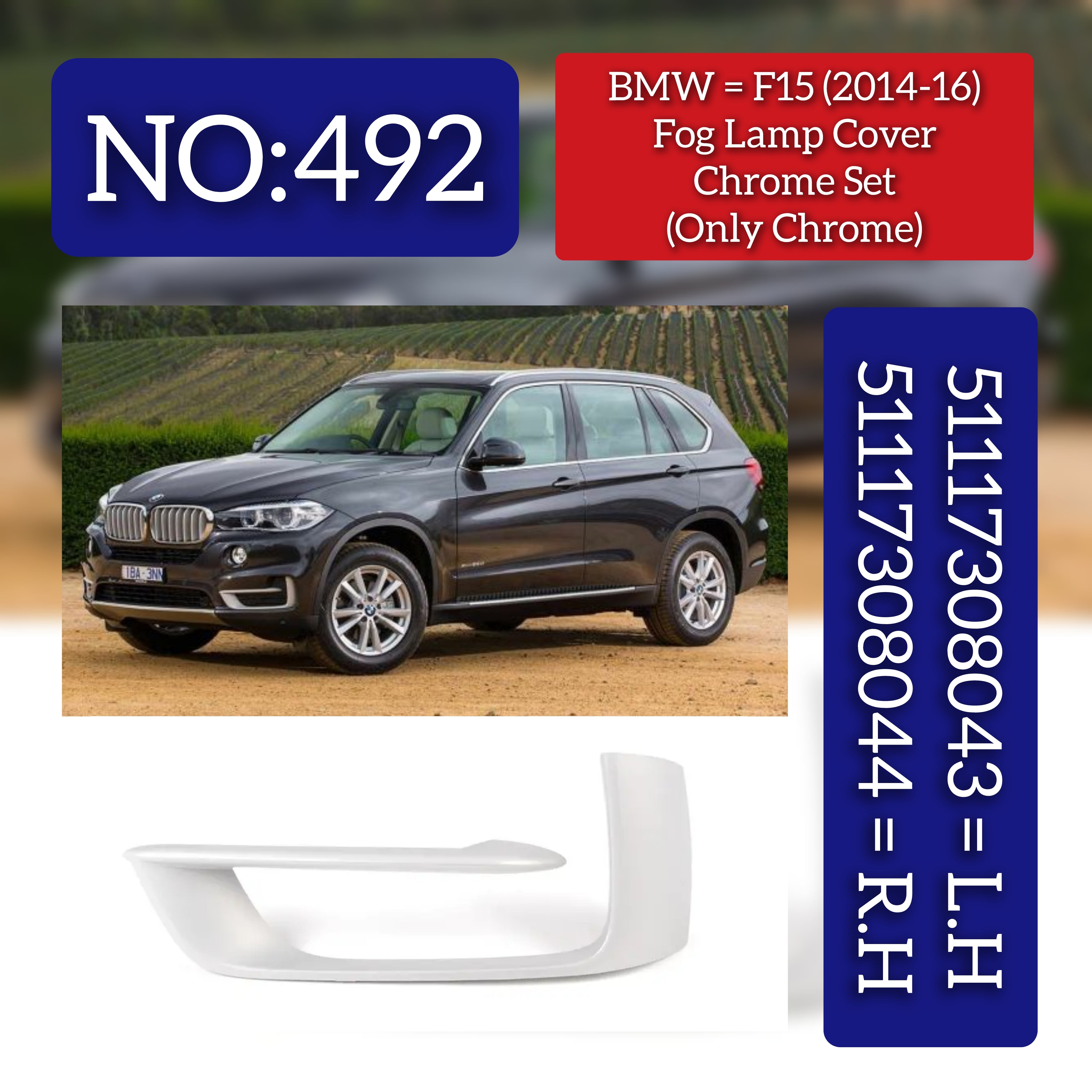 This Front Side Fender Trim Chrome set includes left (51117308043) and right (51117308044) trims designed for BMW X5 (F15, F85) models from 2014 to 2016. Precision-engineered for exact fitment, these chrome trims enhance the vehicle’s exterior by adding a refined, polished look while safeguarding the fender edges. Tagged No.492 for verified compatibility, they provide a durable and stylish solution suitable for professional repairs or aesthetic upgrades.
