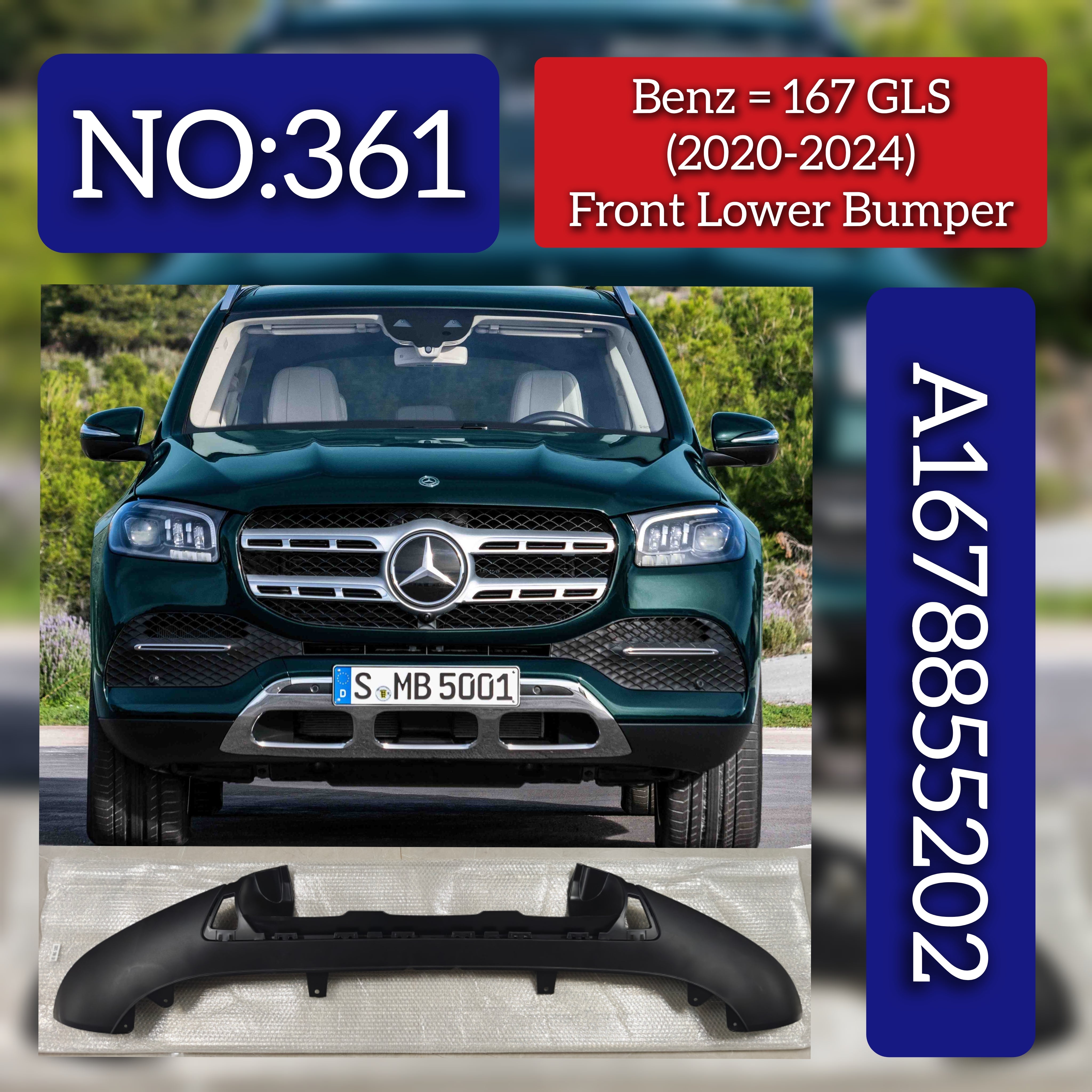 This Front Lower Bumper (part number 1678855202) is designed specifically for the Mercedes-Benz GLS CLASS W167 models from 2020 to 2024. Engineered to meet OEM standards, it ensures a precise fit and maintains the vehicle’s original aesthetics and structural integrity. Ideal for professional repairs or upgrades, this bumper provides reliable protection and preserves the premium look of your GLS CLASS. Tag No.361.