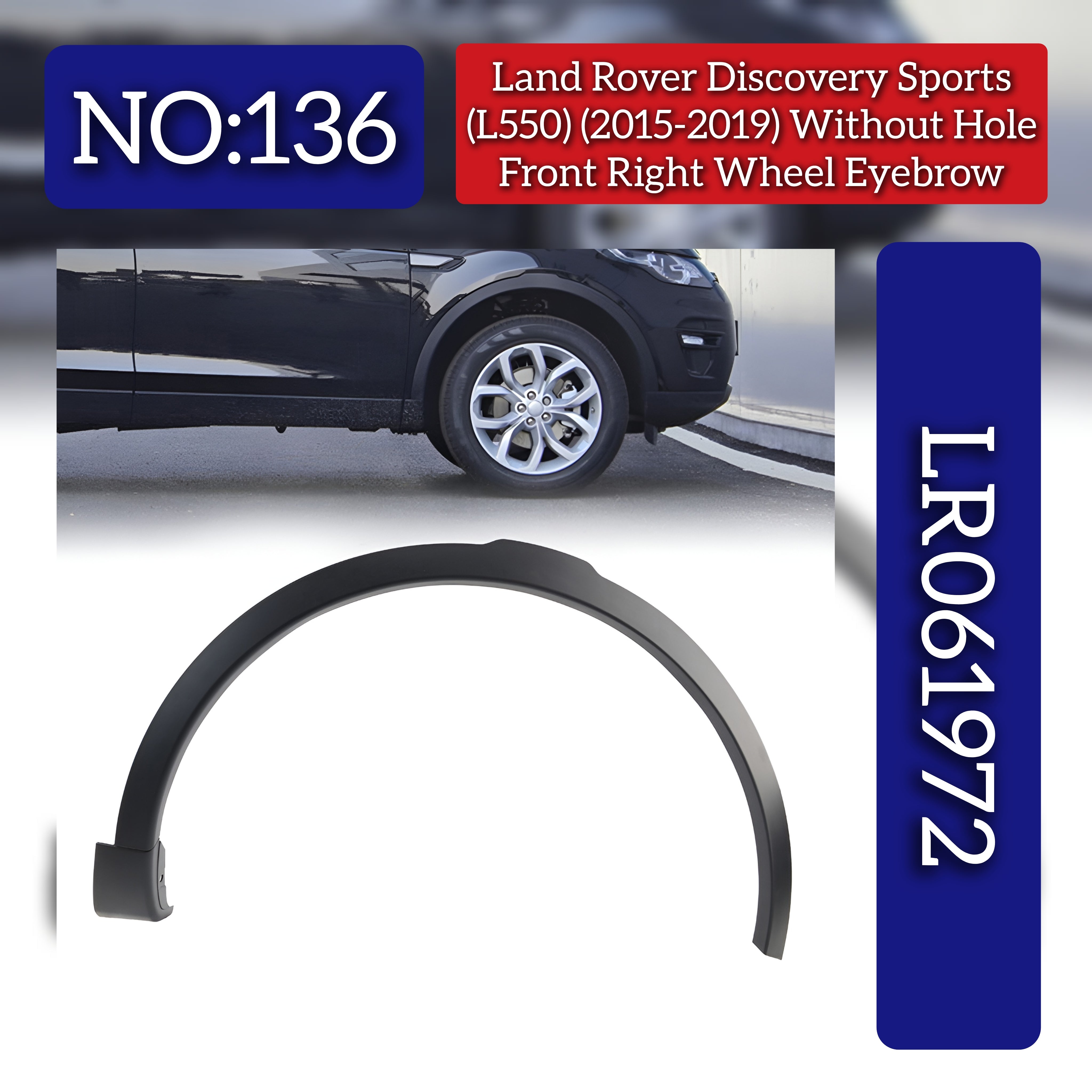 Designed specifically for the Land Rover Discovery Sport L550 (2015-2019), these front wheel eyebrows (Right LR061972 & Left LR061973) provide precise fitment without pre-drilled holes. Manufactured to match original specifications, they ensure protection of your vehicle's wheel arches from debris and minor impacts while maintaining the vehicle’s aesthetic integrity. Ideal for professional repairs or upgrades, these parts deliver durability and an OEM-quality finish.