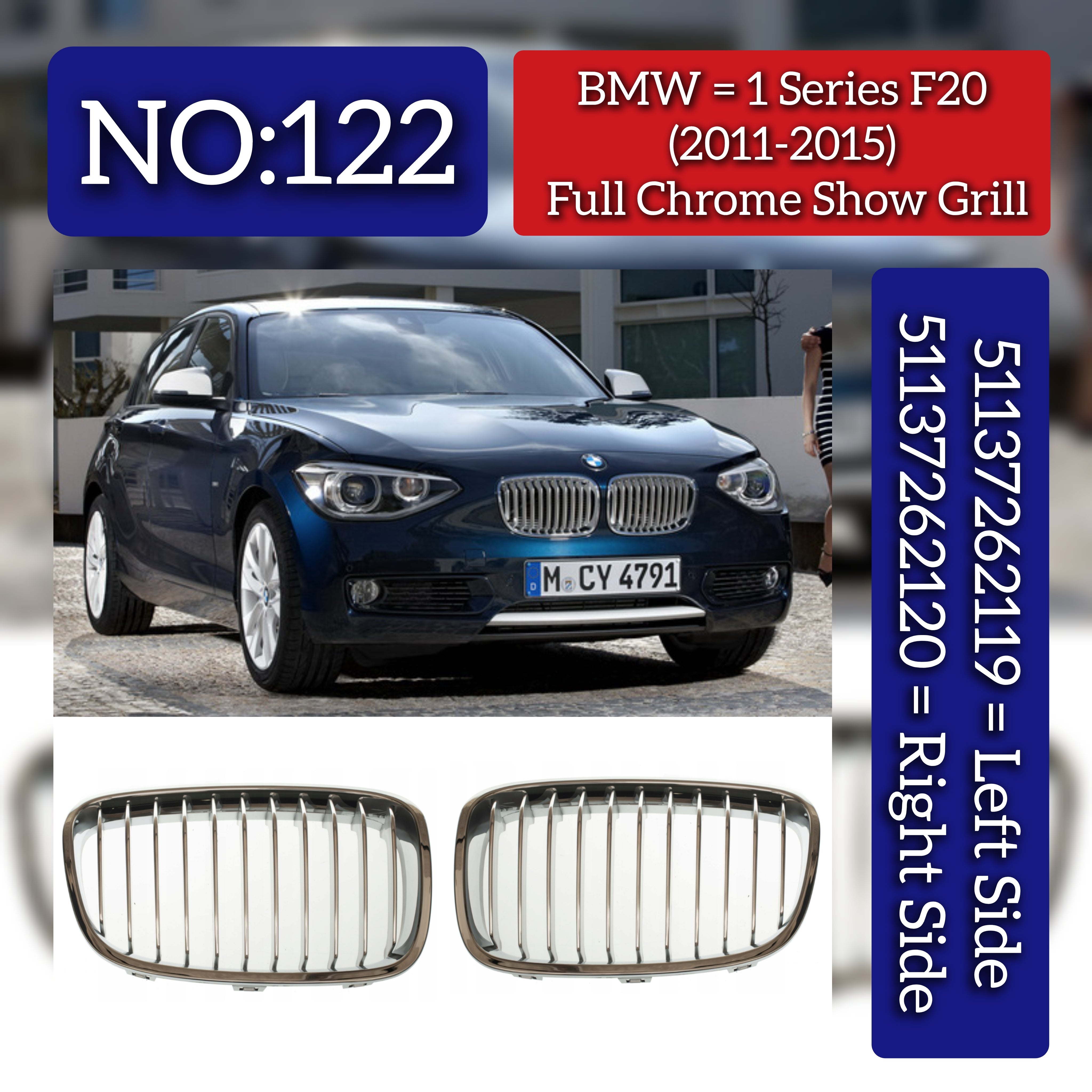 Enhance the front appearance of your BMW 1 Series (F20) from 2011 to 2015 with this Full Chrome Show Grill set. Designed specifically for left (51137262119) and right (51137262120) sides, these grills deliver precise fit and durability. Crafted for seamless integration and lasting shine, they help maintain your vehicle’s premium look while offering reliable protection to the radiator and engine bay. A perfect replacement or upgrade for maintaining OEM standards.