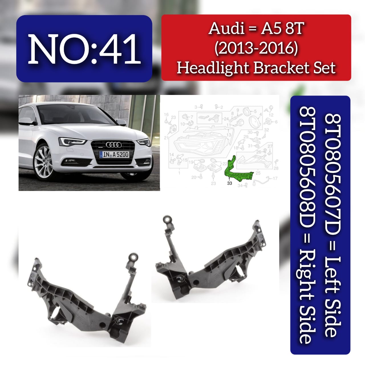 Genuine OEM headlight brackets designed for Audi A5 8T models (2013-2016). This set includes both left (8T0805607D) and right (8T0805608D) brackets, ensuring proper headlight alignment and secure mounting. Direct replacement parts that maintain factory specifications and fitment. Essential components for headlight assembly installation or repair. Engineered to withstand road conditions while keeping your lighting system precisely positioned for optimal visibility and safety.