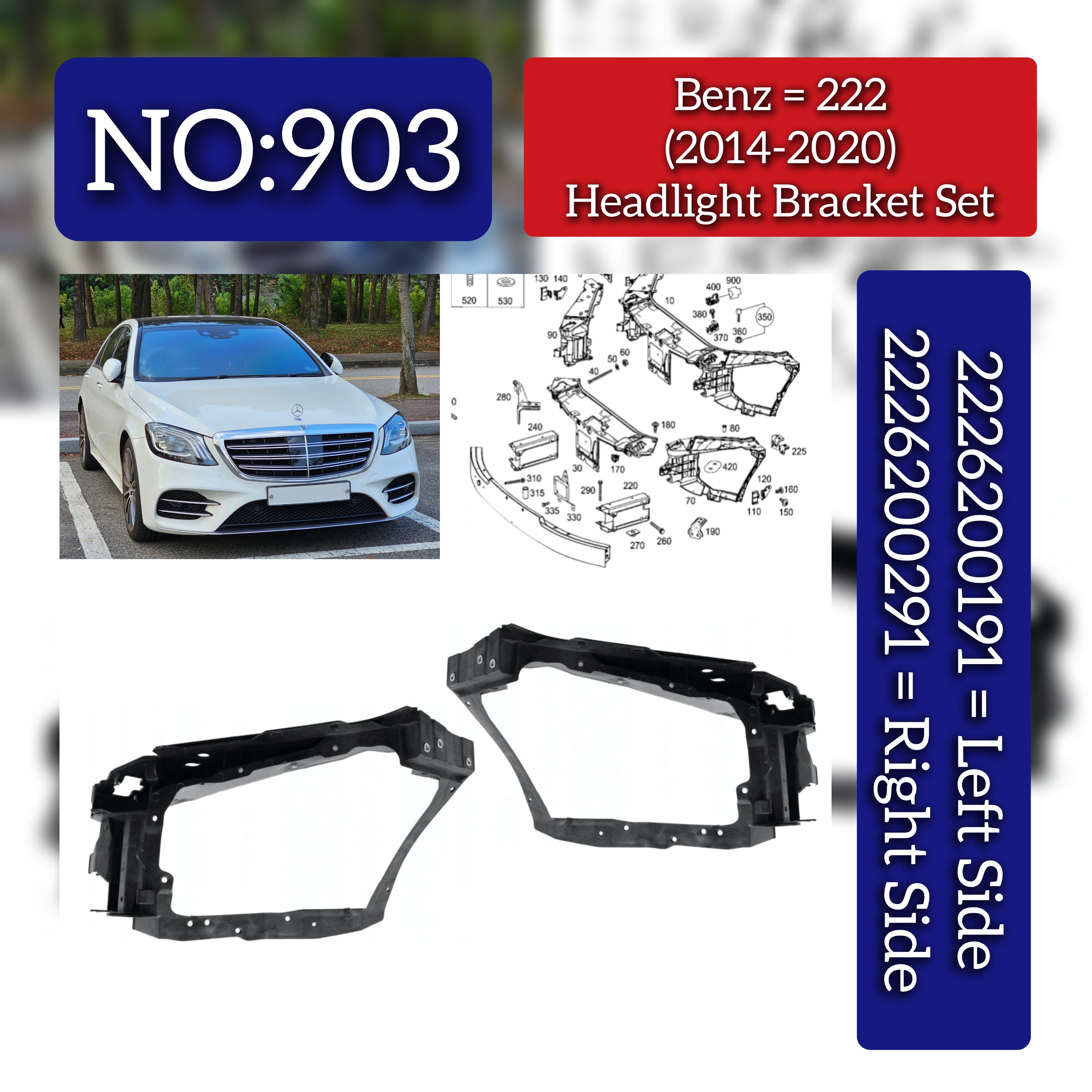 This Headlight Bracket Set, comprising left (2226200191) and right (2226200291) brackets, is engineered to fit the Mercedes Benz S-Class (W222) models from 2014 to 2020. Designed for precise compatibility, these brackets ensure secure mounting of the headlights, maintaining proper alignment and stability. Manufactured to OEM standards, they help preserve vehicle safety and lighting performance, making them a reliable choice for professional repairs or replacements.
