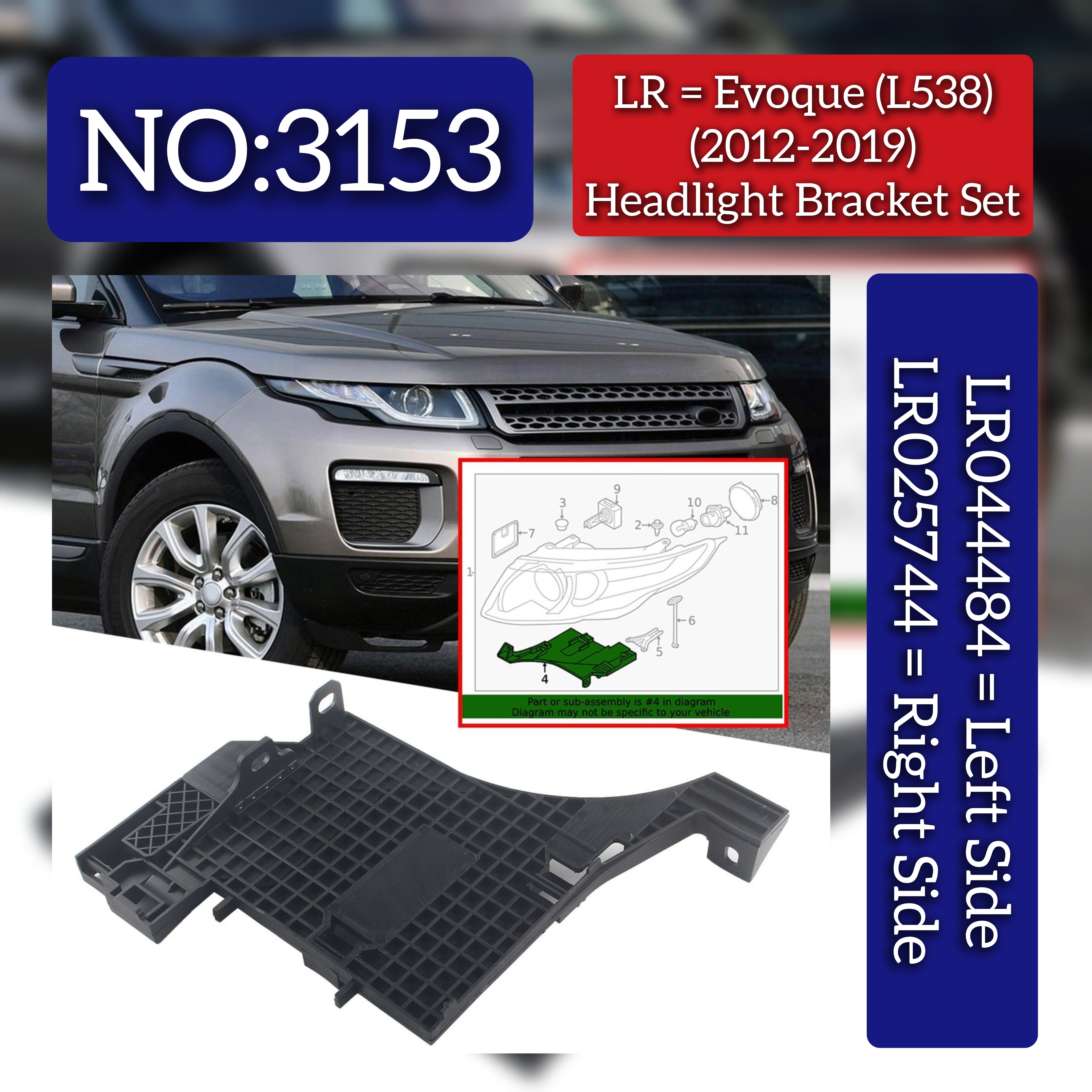 This Headlight Bracket Set, comprising the right LR025744 and left LR044484 brackets, is designed for Land Rover Range Rover Evoque L538 models from 2012 to 2019. Manufactured to exact specifications, these components provide a reliable and secure mounting solution for your headlights, ensuring optimal alignment and durability. Suitable for professional use, this set supports maintaining the original lighting performance and vehicle safety standards.