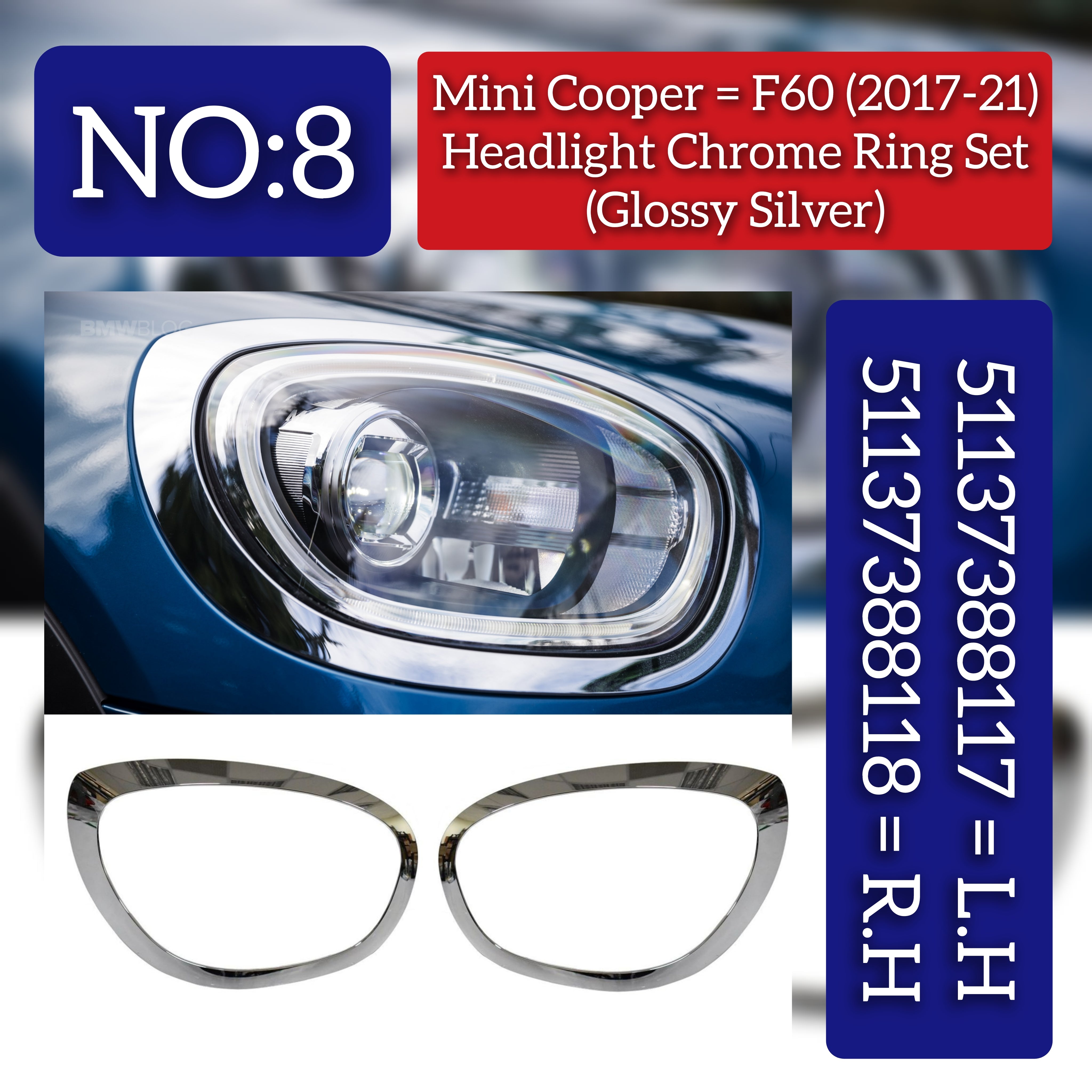 Elevate the look of your MINI F60 with our Headlight Chrome Bezel Ring Trim Set. Crafted with high-quality material, these glossy silver trims 51137388117 (left) and 51137388118 (right) provide a sleek and stylish addition to your vehicle. Enhance your headlight's appearance and stand out on the road.