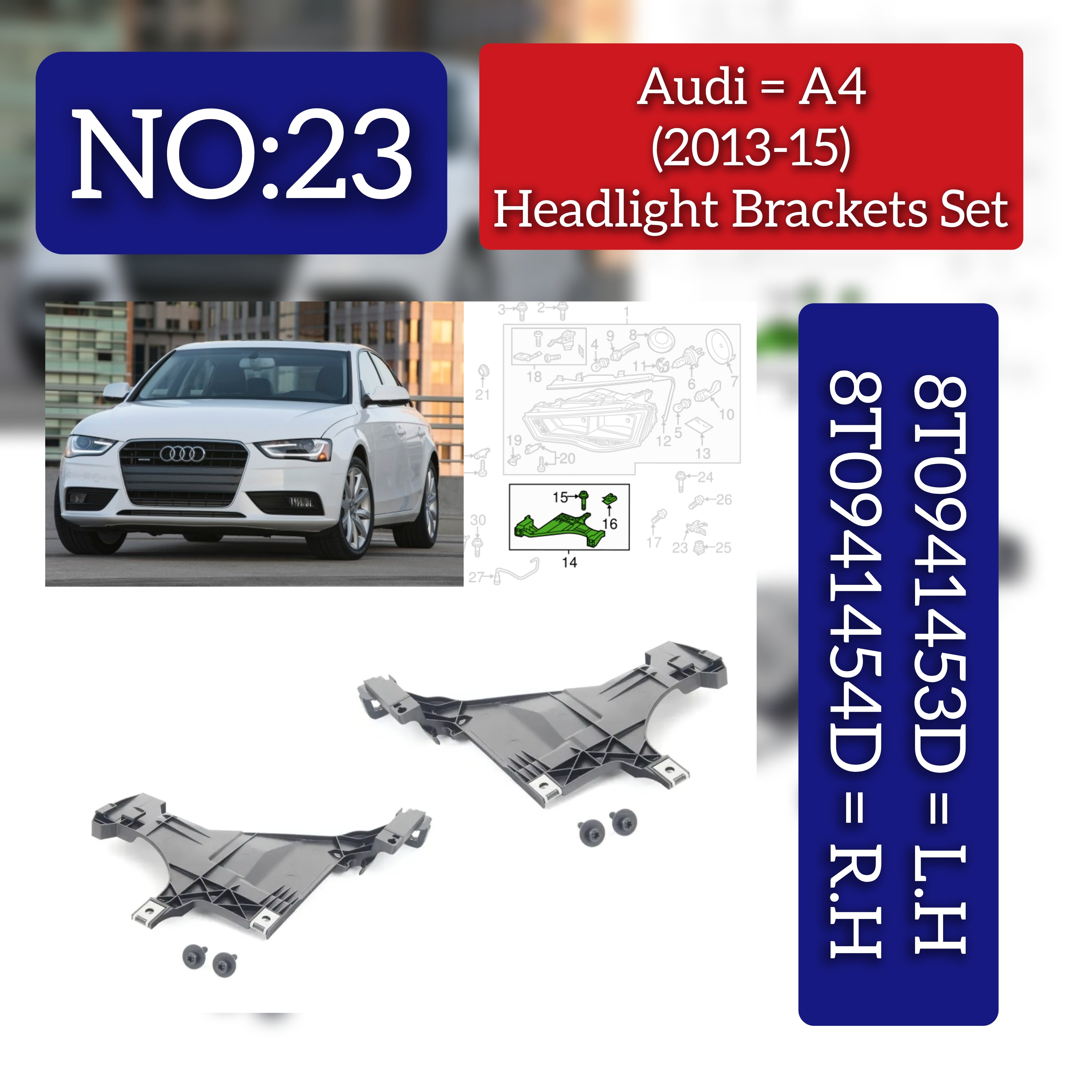 Expertly designed for your AUDI A4 B8 (8K2), this headlight mount retainer plate bracket set (Left 8T0941453D & Right 8T0941454D) ensures a secure and precise fit. Made with high-quality materials, these brackets provide long-lasting durability and reliable performance. Upgrade your vehicle's lighting with confidence.