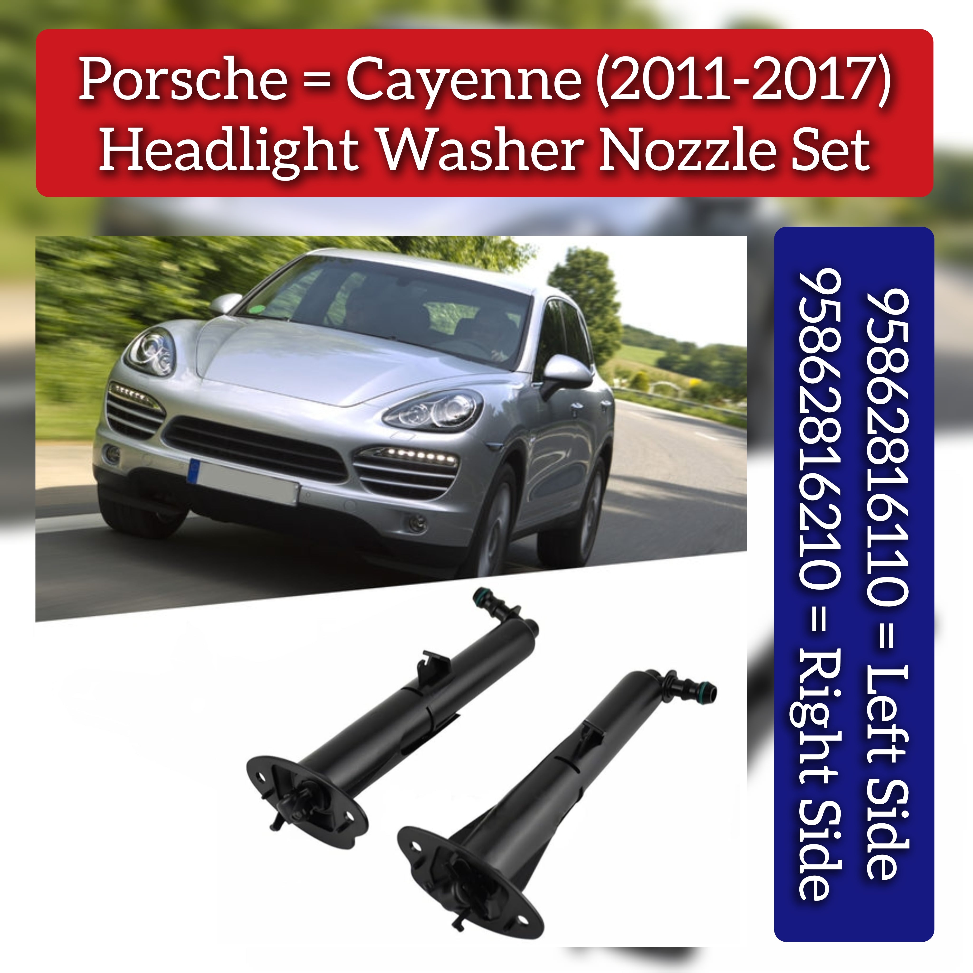 This Headlight Washer Nozzle Set includes both left (95862816110) and right (95862816210) nozzles designed specifically for Porsche Cayenne models from 2011 to 2017 (left) and 2011 to 2018 (right). Engineered to maintain optimal headlight clarity, these nozzles ensure effective cleaning performance, enhancing visibility and safety while driving. Precision fit guarantees seamless integration with your vehicle's existing washer system, helping uphold your Cayenne’s original functionality and appearance. Ideal for professional repairs or OEM-quality replacements.