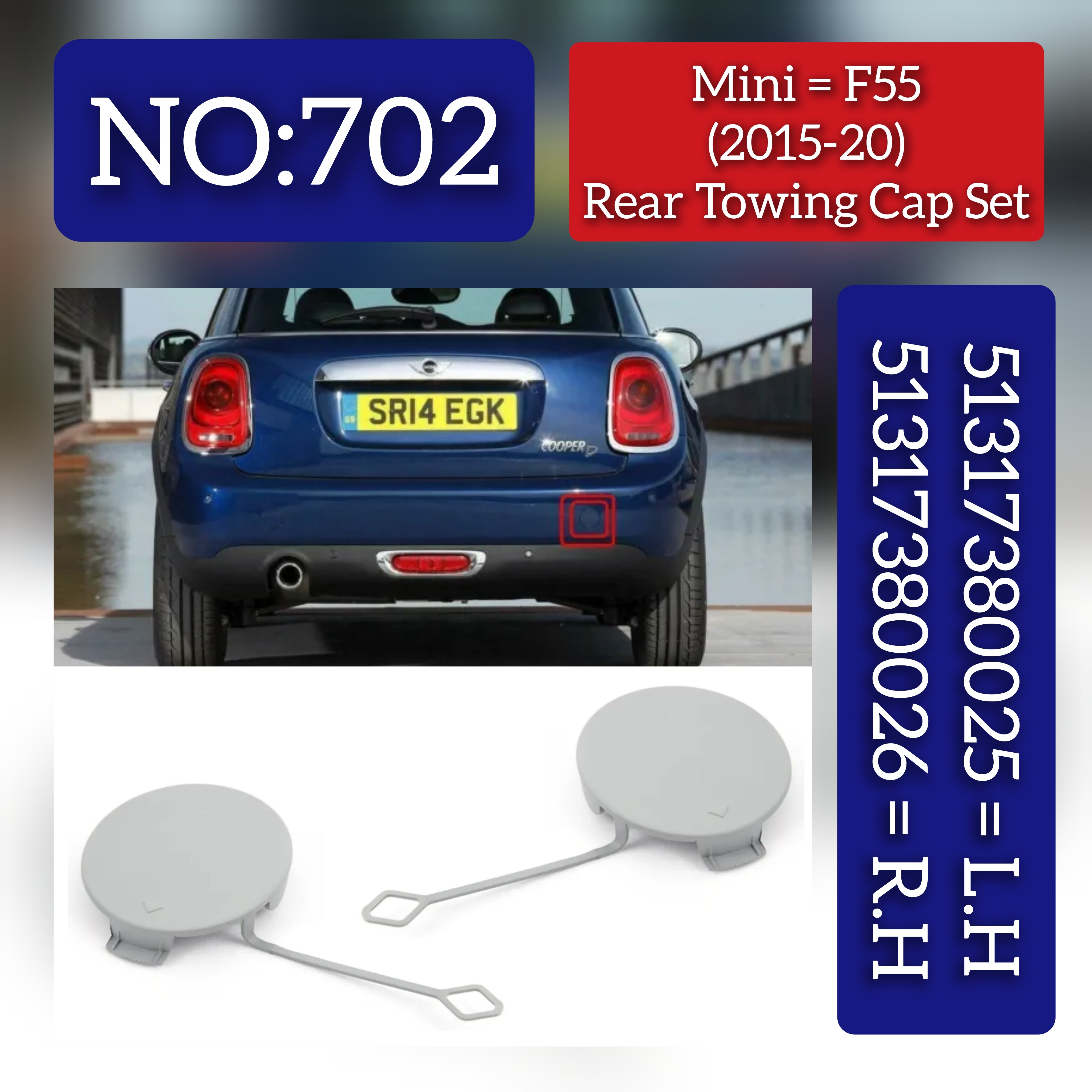 Mini = F55 (2015-20) Rear Towing Cap Set. Part Number: Left Hand(L.H): 51317380025 Right Hand (R.H): 51317380026 ...