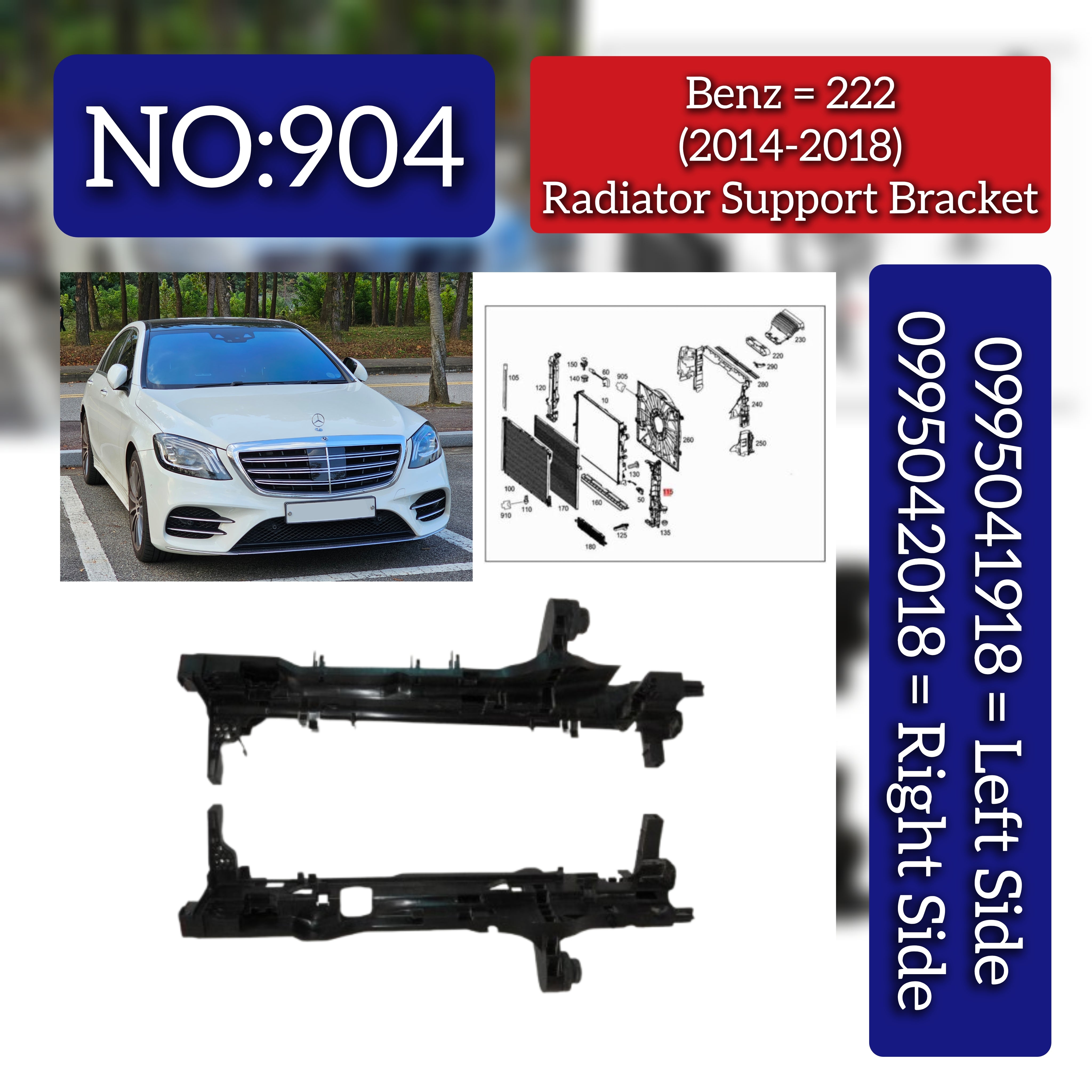 The Radiator Support Brackets Left 0995041918 and Right 0995042018 are designed for seamless compatibility with the Mercedes Benz S-Class (W222) models from 2014 to 2018. These brackets provide essential support to the radiator, ensuring it remains securely mounted and properly aligned. By minimizing vibration and potential damage, they help maintain optimal cooling system performance and contribute to the overall durability and reliability of the vehicle’s front-end structure. These parts are engineered to meet high-quality standards for precise fit and long-lasting performance.