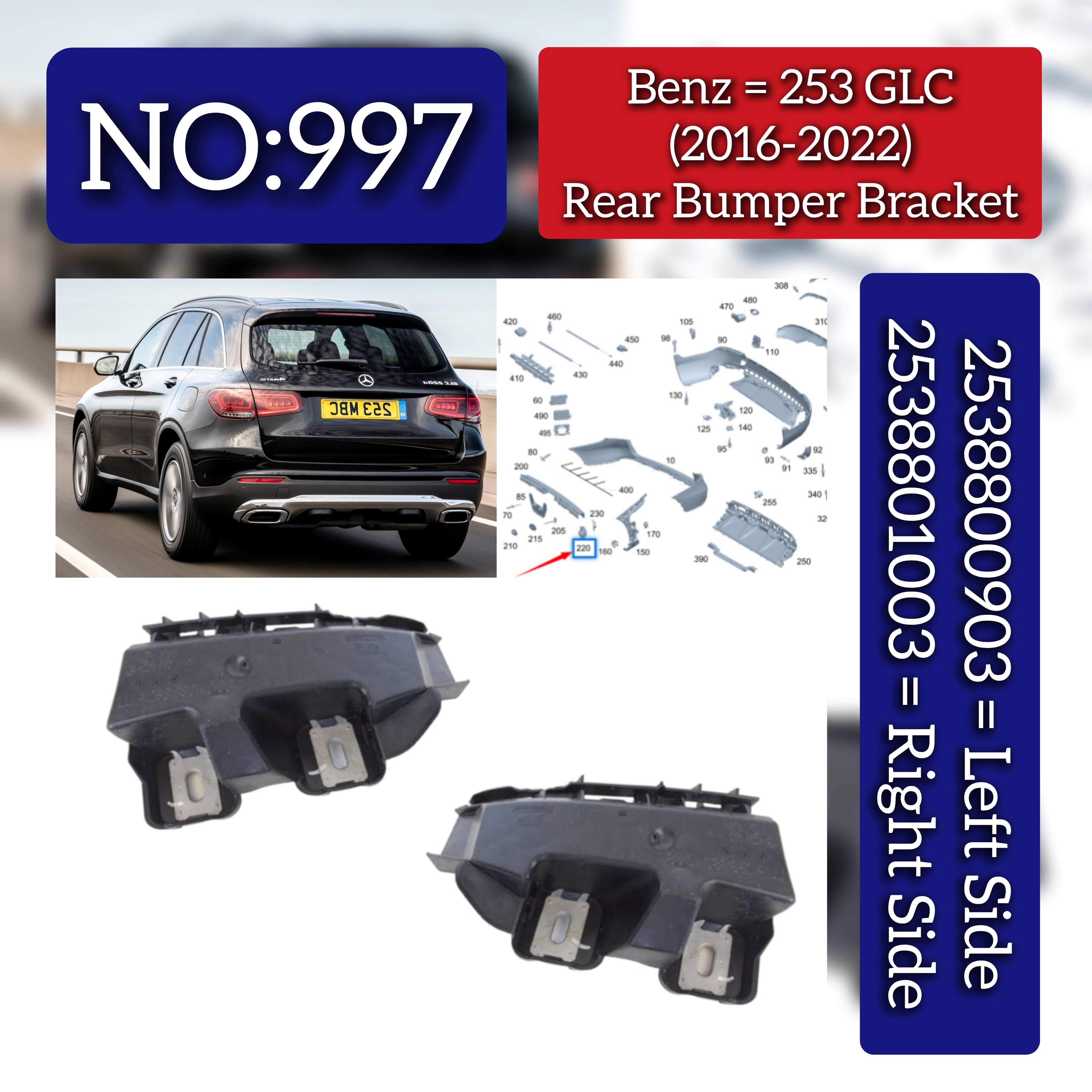 Designed specifically for the Mercedes Benz 253-GLC (2016-2022), these rear bumper brackets (Left 2538800903 & Right 2538801003) ensure precise alignment and reliable support for the rear bumper assembly. Manufactured to OEM specifications, they deliver structural strength and durability, helping maintain your vehicle’s safety and appearance after repairs or replacements. Perfect for professional use, these brackets facilitate efficient installation while preserving the integrity of your luxury SUV’s rear end.