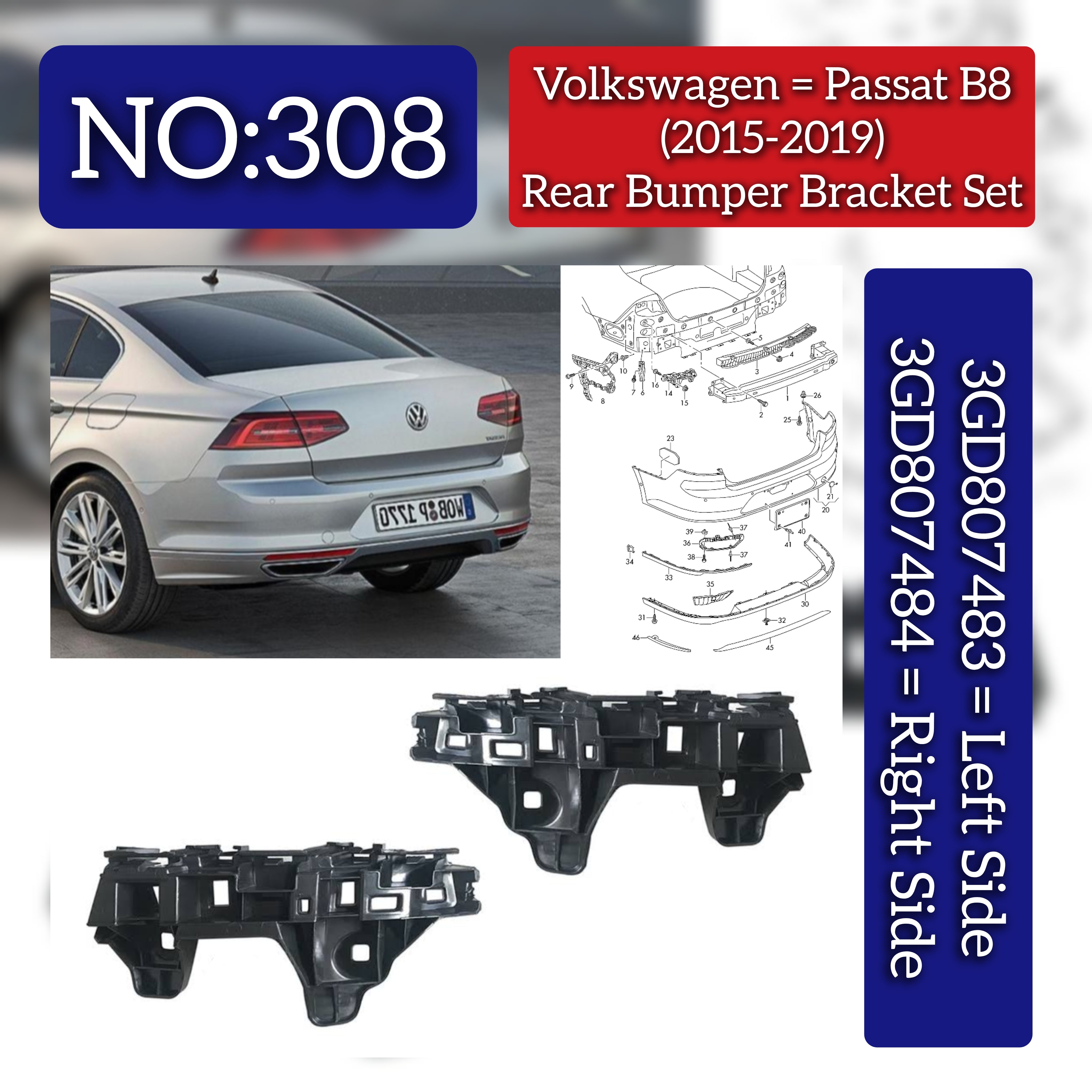 These rear bumper brackets, left (3GD807483) and right (3GD807484), are designed specifically for the Volkswagen Passat B8 (362). Engineered to meet OEM specifications, they provide precise fitment and robust support for the rear bumper assembly. Ideal for professional repairs or replacements, these brackets ensure proper alignment and durability, maintaining the vehicle’s structural integrity and appearance.
