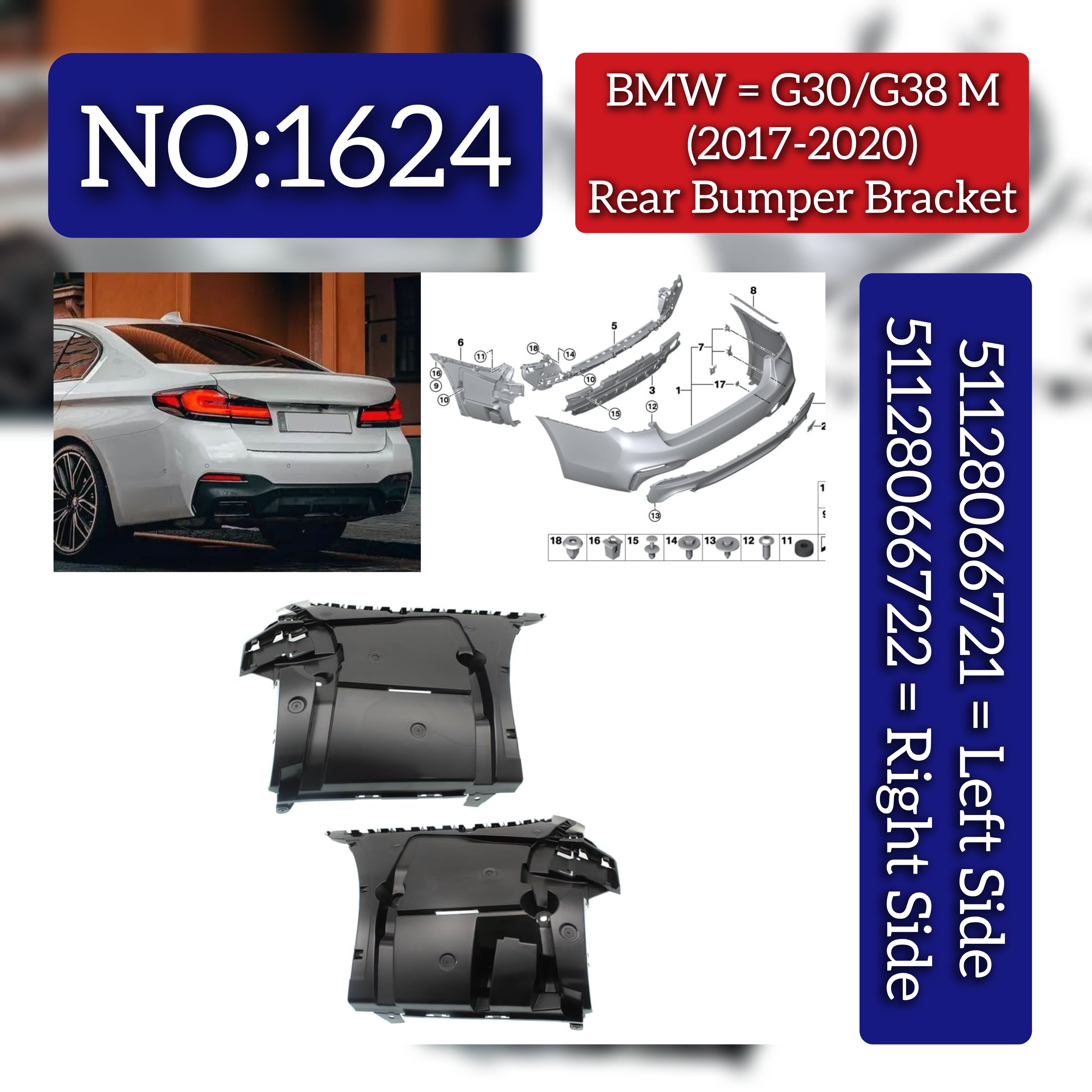 Ensure a secure and precise fit for your BMW 5 Series (G30, F90) models from 2017 to 2020 with these rear bumper brackets. Designed specifically for the left (51128066721) and right (51128066722) sides, they provide reliable support to maintain bumper alignment and stability. Engineered to meet OEM standards, these brackets contribute to overall vehicle safety and structural integrity during impact. Easy to install, they help preserve your BMW’s original build quality and appearance. Ideal for professional repairs or replacements.