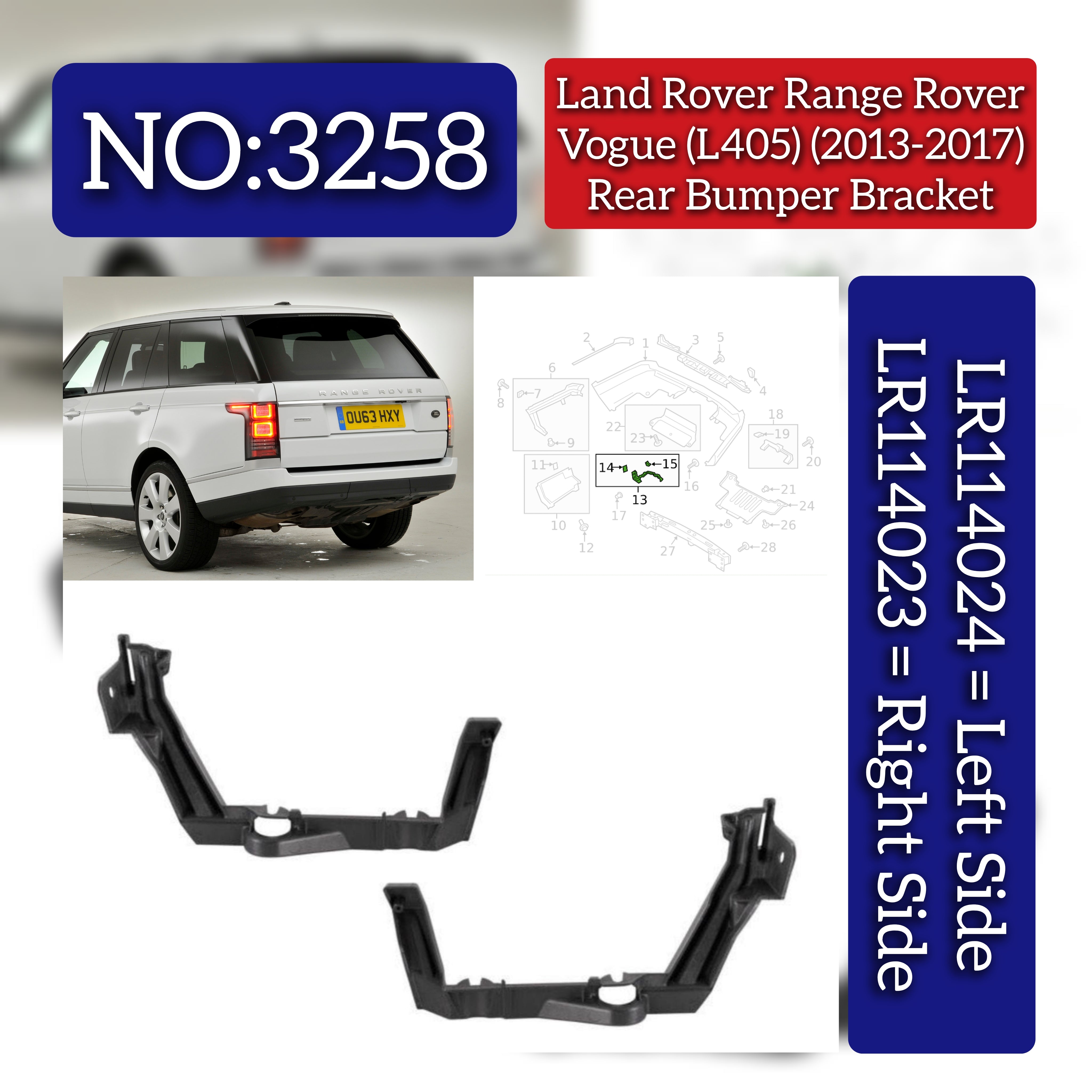 Designed specifically for the Land Rover Range Rover Vogue L405 (2013-2017), these rear bumper brackets (Right LR114023 and Left LR114024) provide precise fitment and robust support to maintain bumper alignment and structural integrity. Manufactured to OEM specifications, they ensure durability and reliable performance, helping to secure your bumper firmly in place and preserve the vehicle’s original safety standards. Ideal for professional repairs or replacements, these brackets facilitate a seamless restoration of your vehicle’s rear assembly.