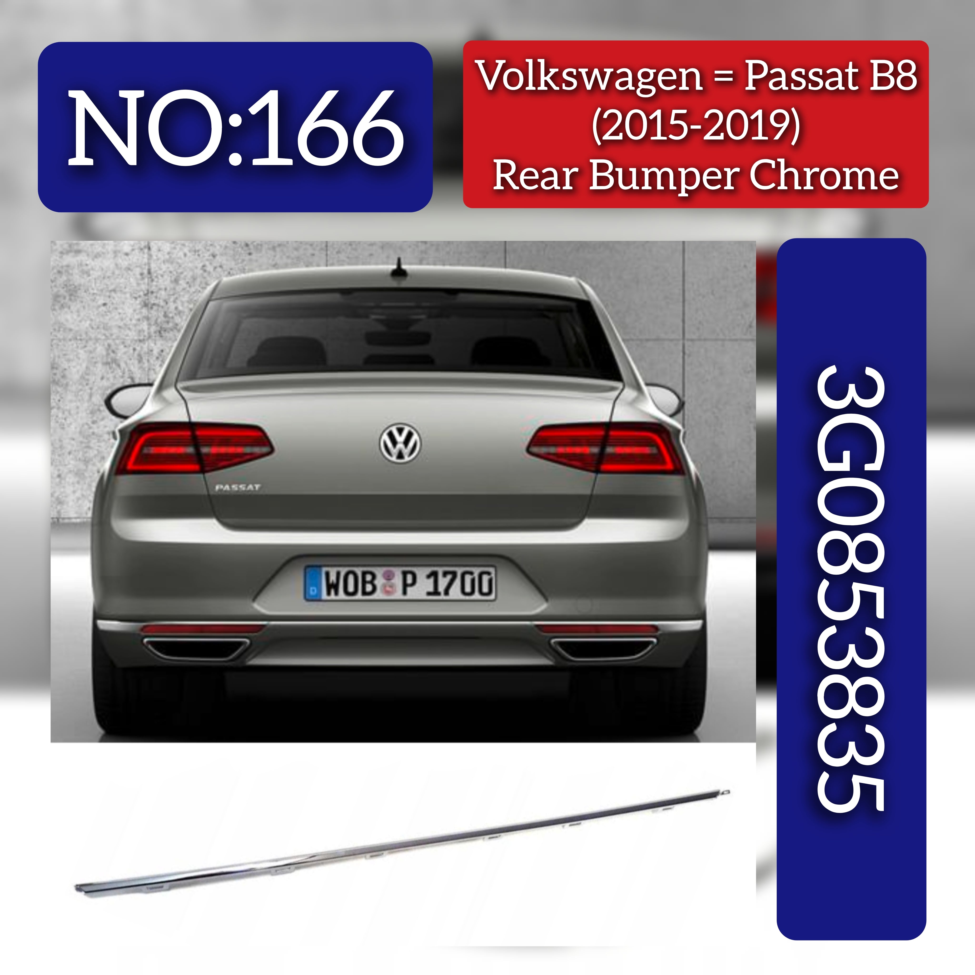 Enhance your Volkswagen Passat B8 (362) with this precision-engineered Rear Bumper Chrome 3G0853835. Designed for exact compatibility, it ensures a seamless fit and restores your vehicle’s sleek, polished appearance. Crafted to withstand daily wear, this chrome bumper adds both style and durable protection to your car’s rear, maintaining its premium look while safeguarding against minor impacts. Ideal for professional replacements or upgrades, it meets high-quality standards for performance and aesthetics.