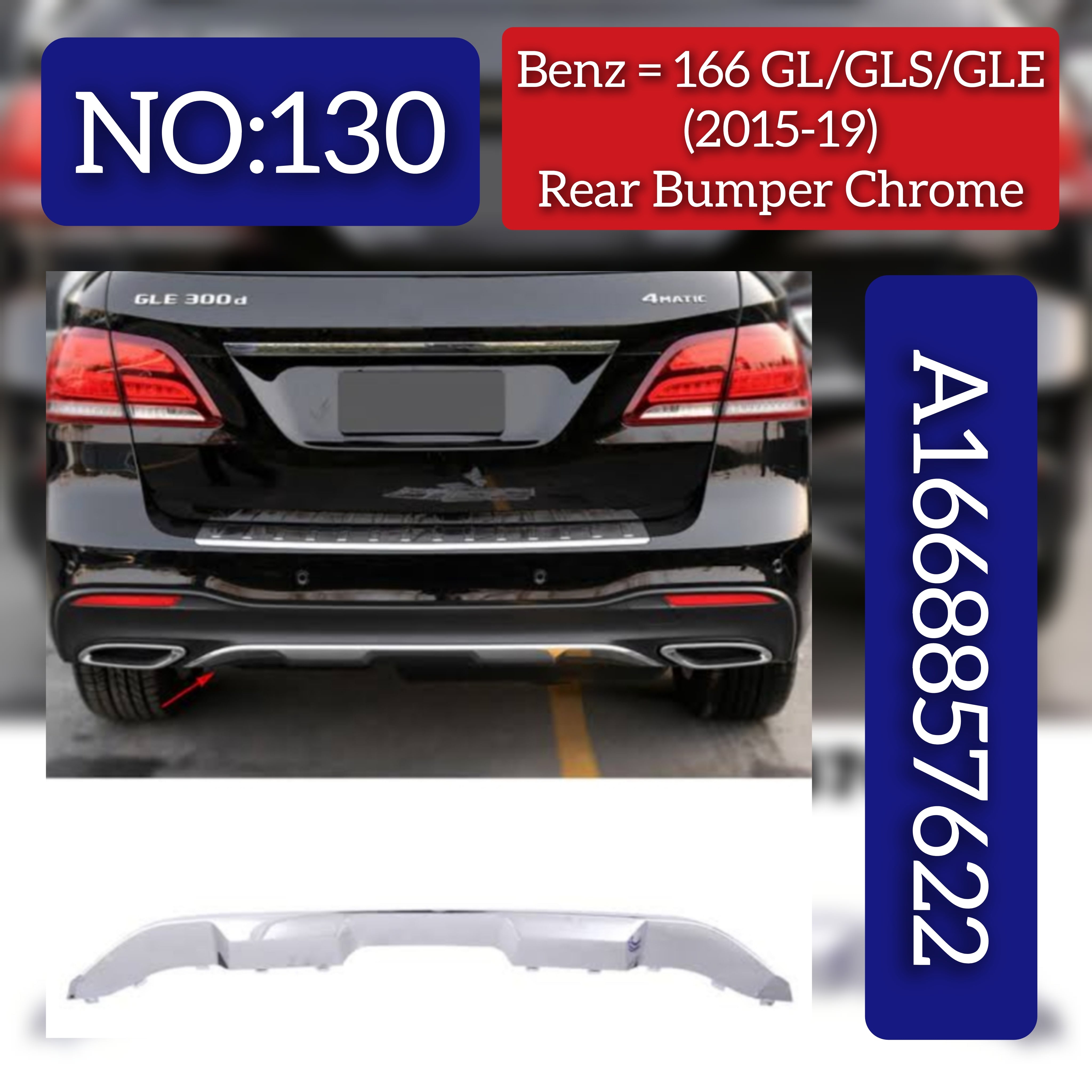 Genuine OEM rear bumper in polished chrome finish, engineered for Mercedes-Benz GL, GLS, and GLE models (W166 platform, 2015-2019). Part number A1668857622 ensures perfect fitment and factory specifications. This premium bumper delivers authentic styling while providing robust protection against minor impacts. Direct replacement component restores your vehicle's original appearance and structural integrity. Ideal for collision repairs or aesthetic upgrades on these luxury SUV platforms.