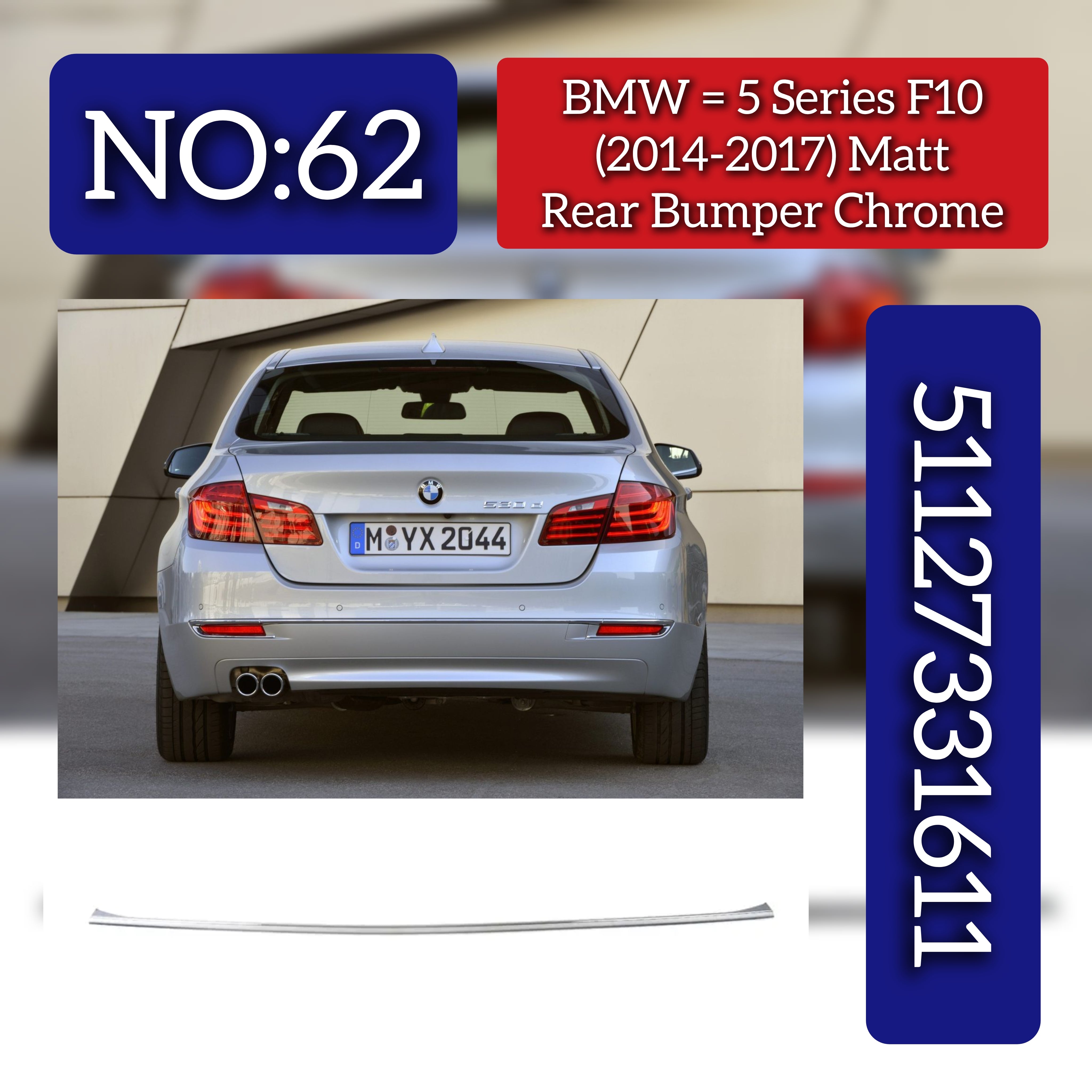 Designed for BMW 5 Series (F10) models from 2014 to 2017, this matt chrome rear bumper (part number 51127331611) offers precise fitment and superior durability. It enhances the vehicle's rear appearance with a subtle, sophisticated finish while providing reliable protection against minor impacts. An ideal choice for replacement or upgrade, this bumper maintains the premium style and structural integrity of your BMW.