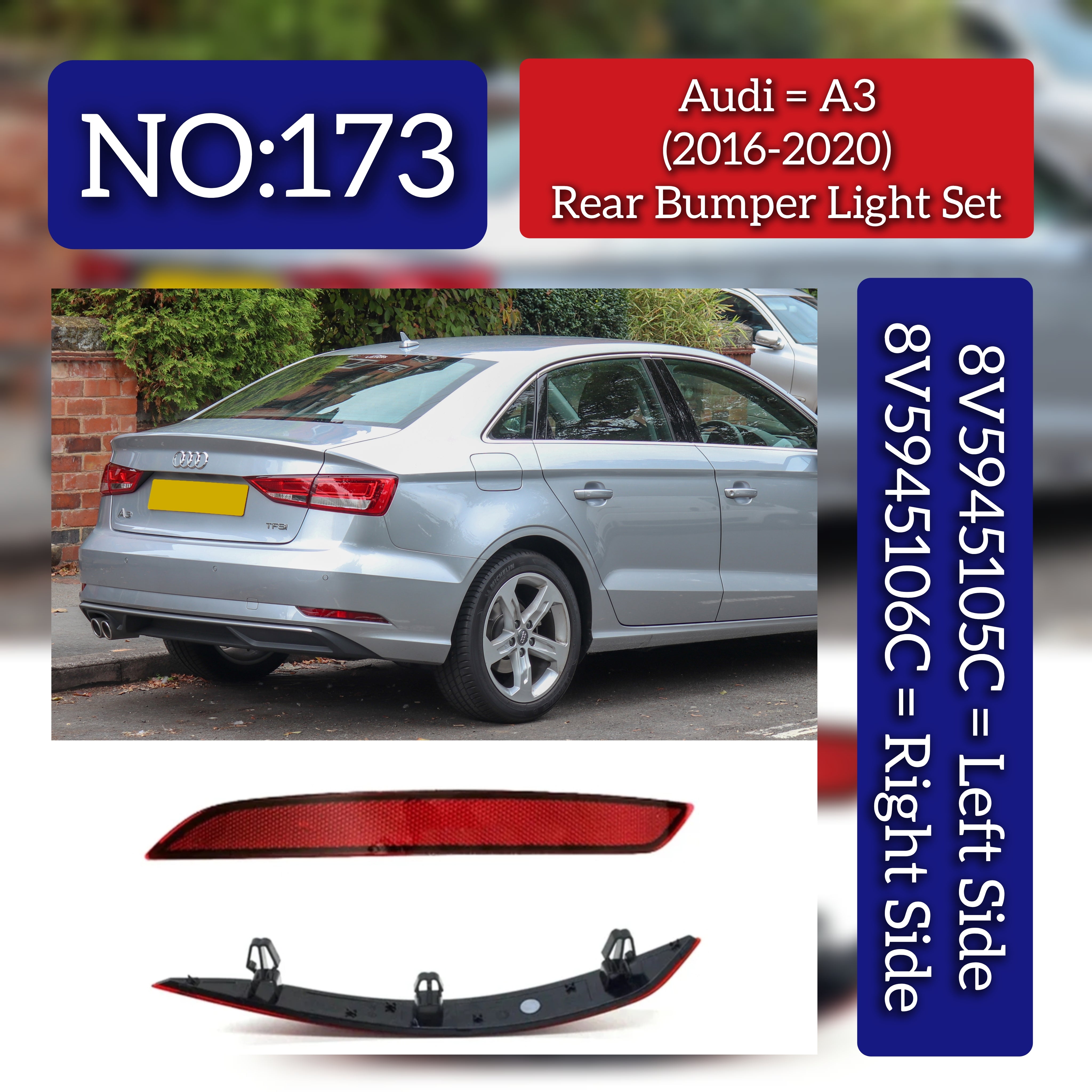 Enhance your Audi A3’s safety and style with this Rear Bumper Light Set, featuring left (8V5945105C) and right (8V5945106C) units. Designed specifically for Audi A3 Convertible (8V7, 8VE), A3/S3, and A3 Limousine (8VS, 8VM) models from 2016 to 2020, these lights ensure perfect fit and reliable illumination. Upgrade your vehicle with precise OEM compatibility for optimal visibility and durability on the road.