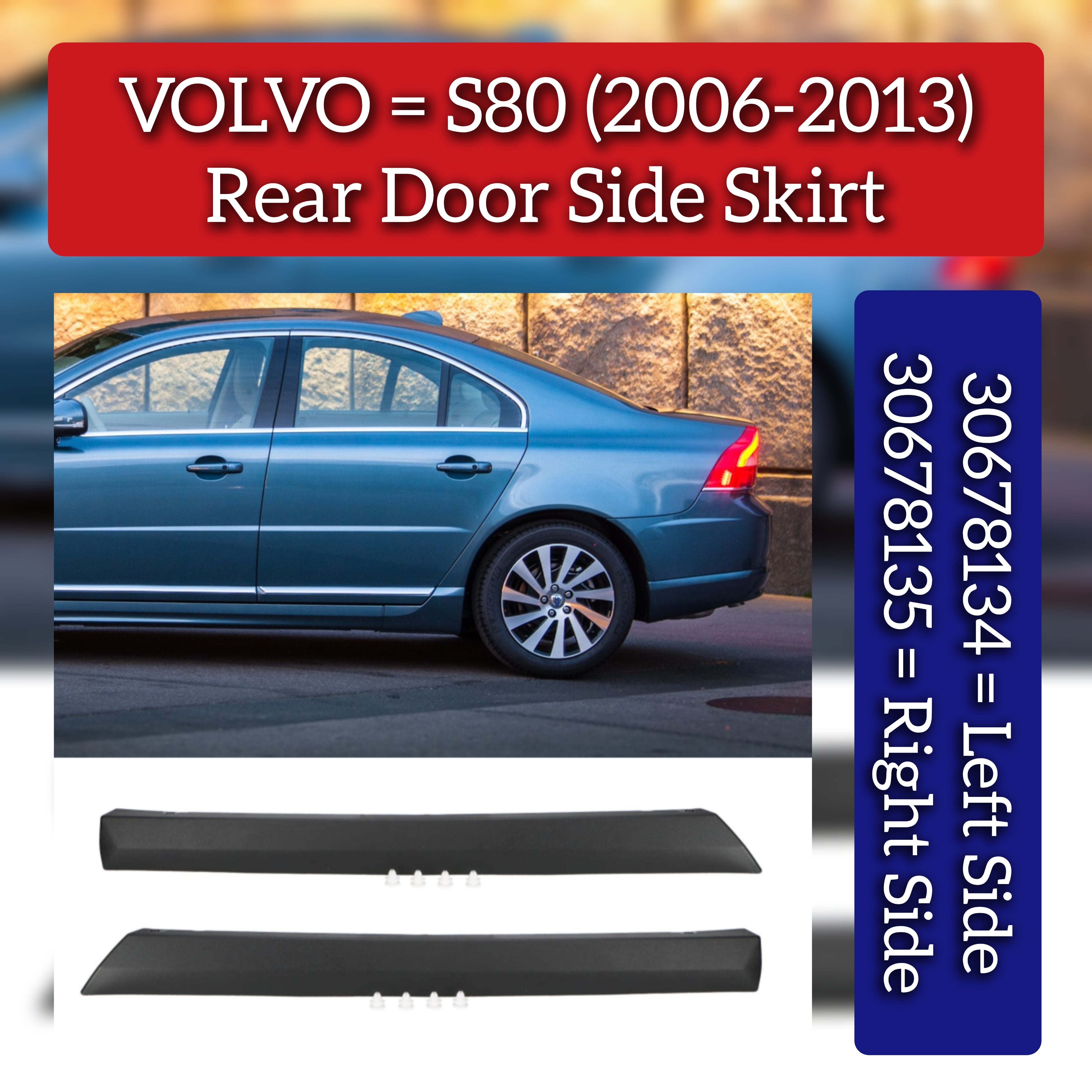 Enhance the side profile of your VOLVO S80 (2006-2013) with this precision-engineered Rear Door Side Skirt Set. Designed specifically for left (39862508, 30678134) and right (39862524, 30678135) doors, these skirts ensure perfect fitment and durability. Crafted to seamlessly integrate with your vehicle's body, they help protect lower door panels from road debris while adding a refined, sporty aesthetic that maintains the original design intent. An ideal upgrade for both form and function, tailored to Volvo’s exact specifications.