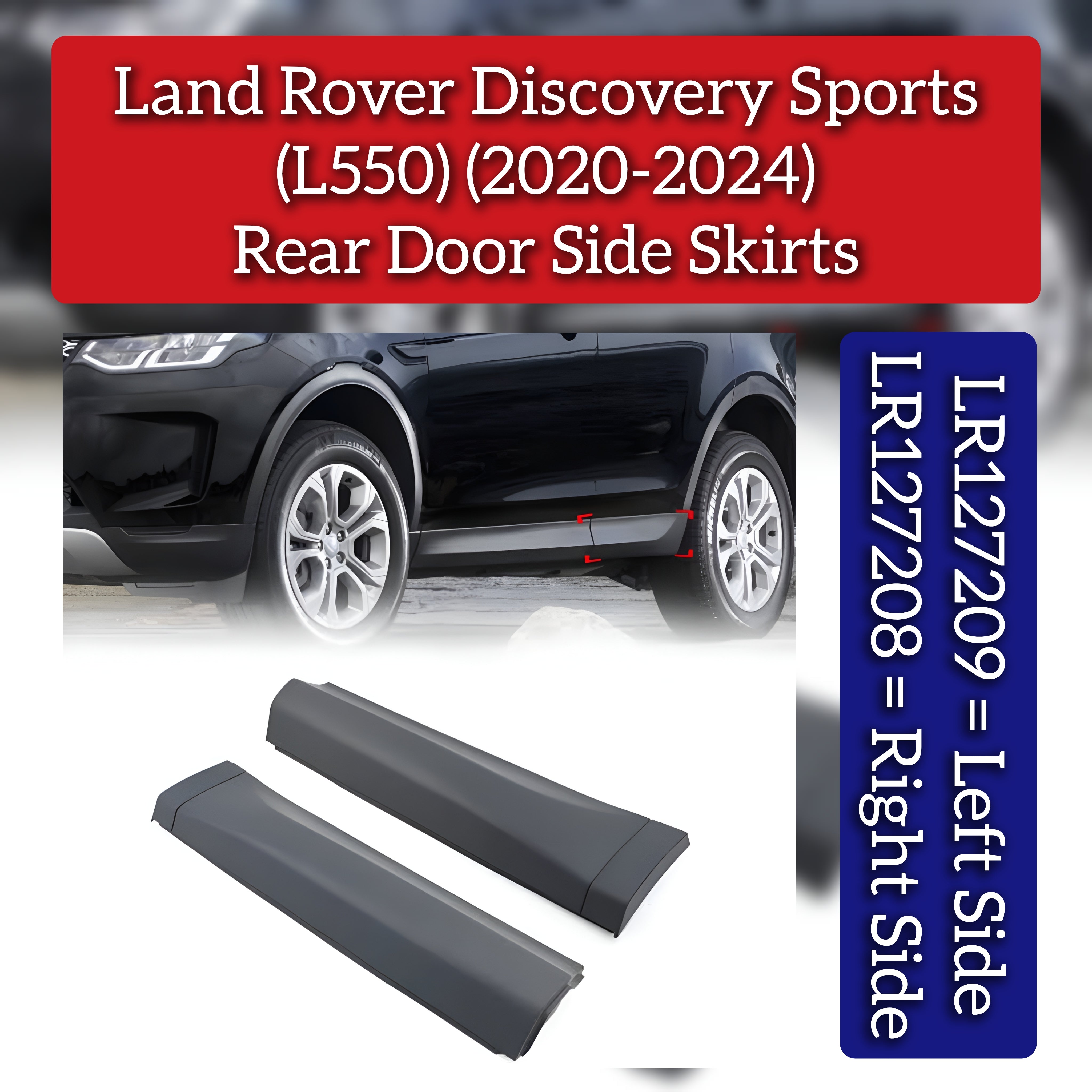 These rear door side skirts, part numbers LR127208 (right) and LR127209 (left), are designed specifically for the Land Rover Discovery Sport L550 models from 2020 to 2024. Engineered to fit perfectly, they enhance the vehicle's exterior protection by shielding the lower door areas from debris and potential damage. Crafted with durable materials, these side skirts maintain the vehicle's original style while offering added resilience on road or off-road conditions. Ideal for owners seeking precise fitment and factory-quality replacement parts.