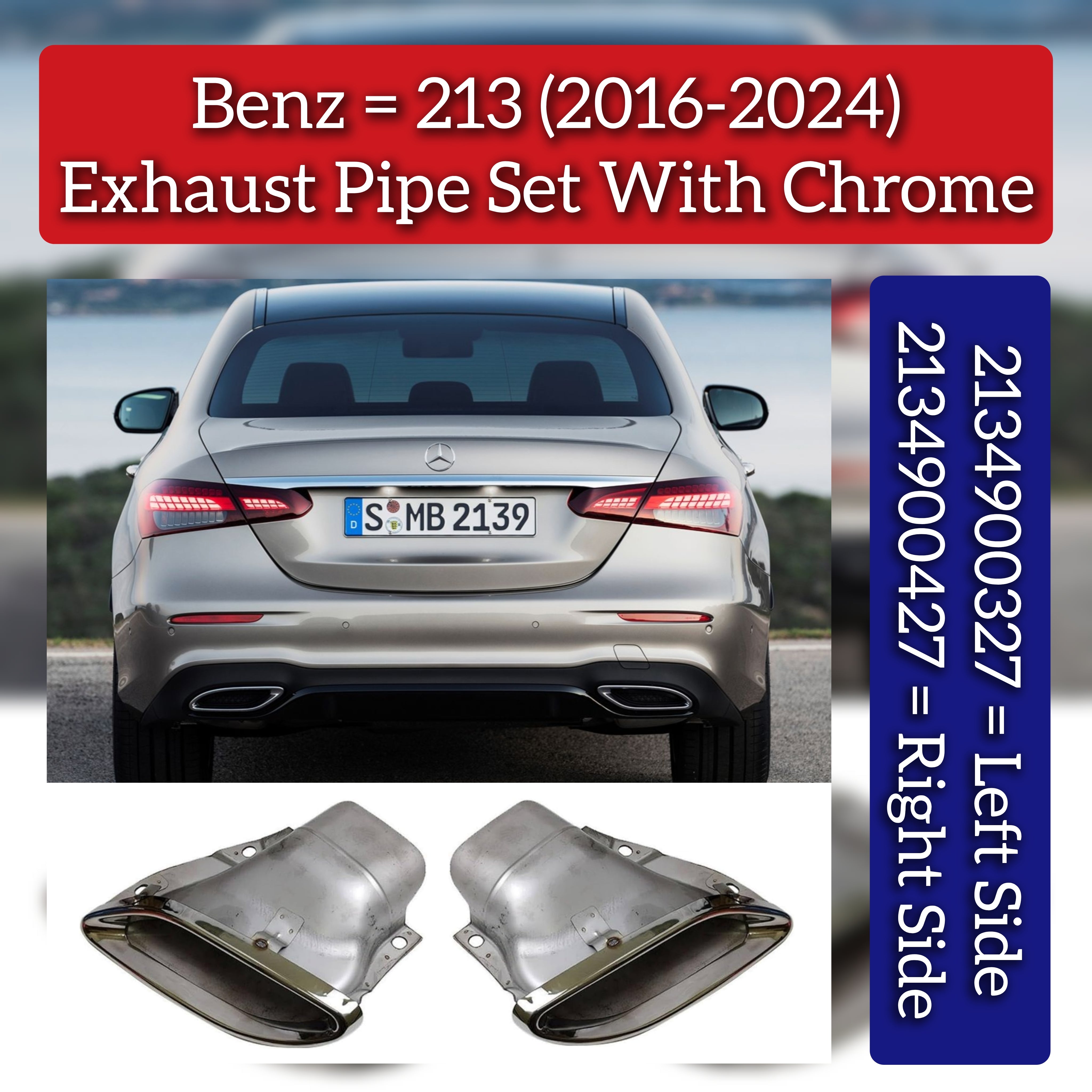 Enhance your Mercedes-Benz E-Class (W213) from 2016 to 2024 with this precision-engineered rear exhaust pipe set, featuring chrome-finished left (2134900327) and right (2134900427) components. Designed for perfect fitment and durability, these pipes improve exhaust flow while adding a sleek, polished look to your vehicle’s rear. Crafted to meet OEM standards, they ensure reliable performance and longevity, making them an ideal upgrade for maintaining your car’s efficiency and style.