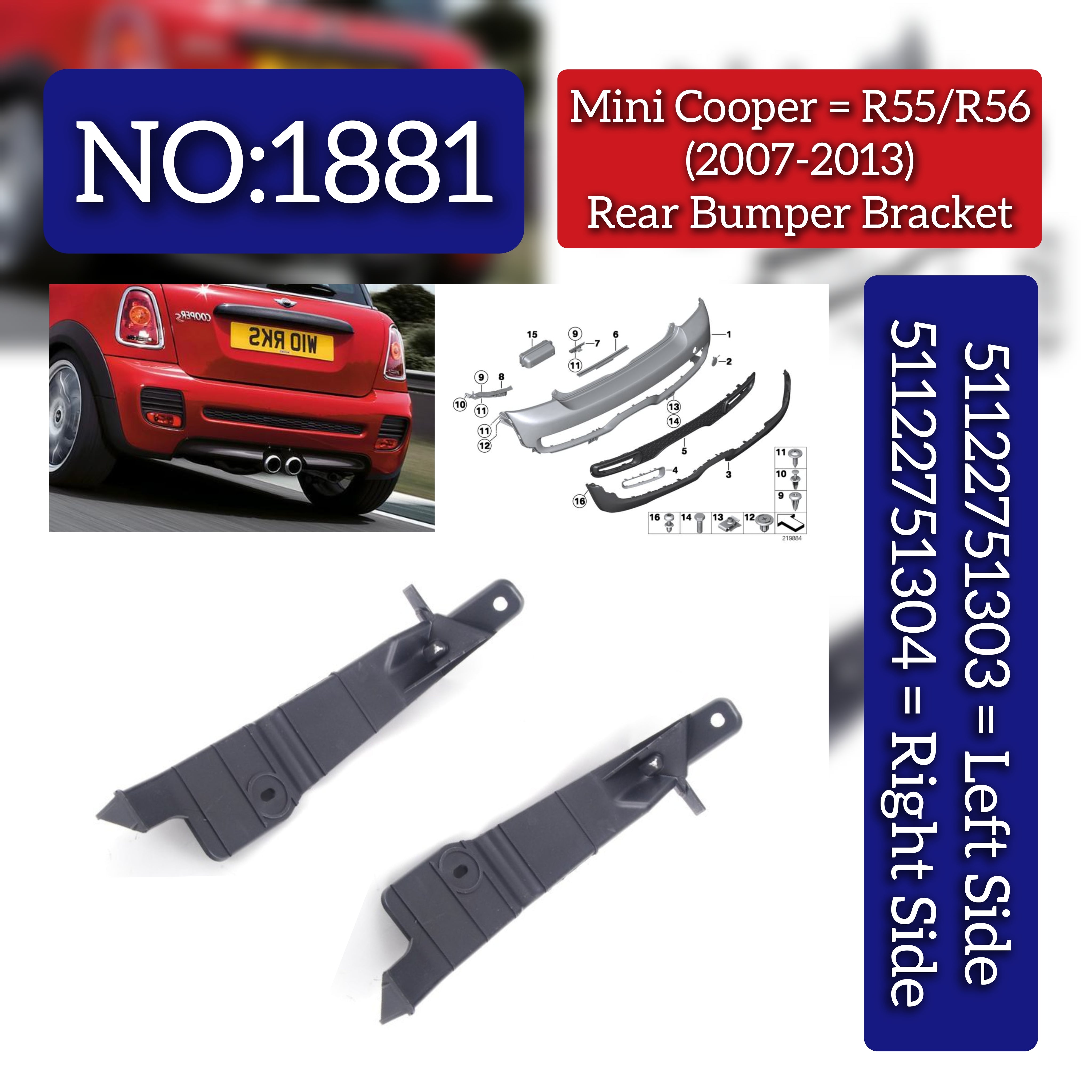Enhance your Mini Cooper Clubman (R55) and Hardtop (R56) (2007-2013) rear bumper stability with this genuine pair of left (51122751303) and right (51122751304) bumper brackets. Engineered for precise fit and durability, these brackets ensure secure mounting and maintain vehicle integrity after repairs or upgrades. Ideal for professional repairs, they uphold factory standards to safeguard your vehicle’s rear structure. Tag No.1881.
