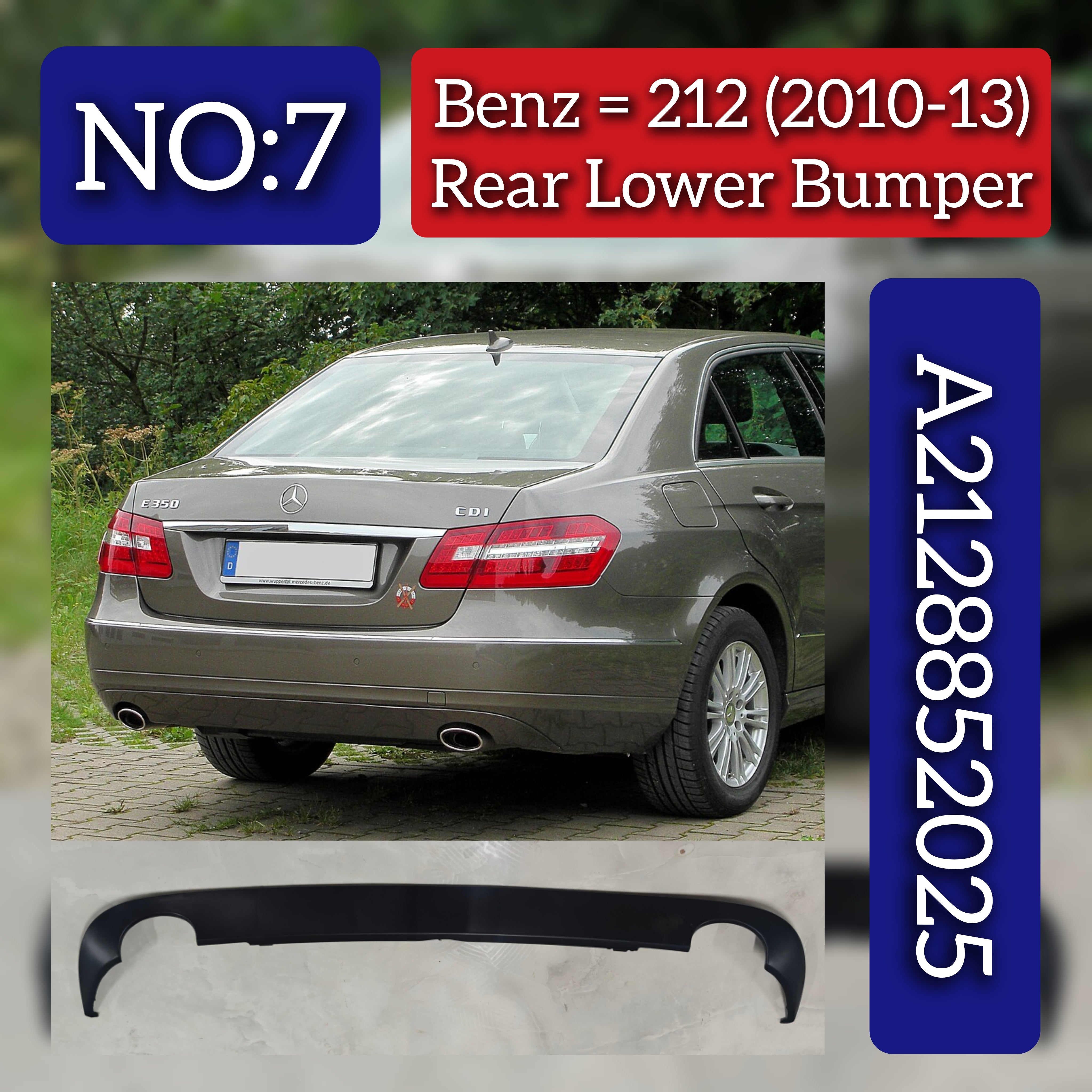 The Rear Lower Bumper 2128852025 (A2128852025) is engineered specifically for the Mercedes Benz E-Class (W212) models from 2010 to 2013. Designed to fit precisely, this bumper ensures seamless integration while maintaining the vehicle's original look and structural integrity. Its durable construction offers reliable protection against rear-end impacts, helping preserve your car’s bodywork and safety features. This replacement part meets manufacturer standards, making it an essential component for professional repairs and restorations. Perfect for restoring the rear profile of your Mercedes E-Class with precision and quality.