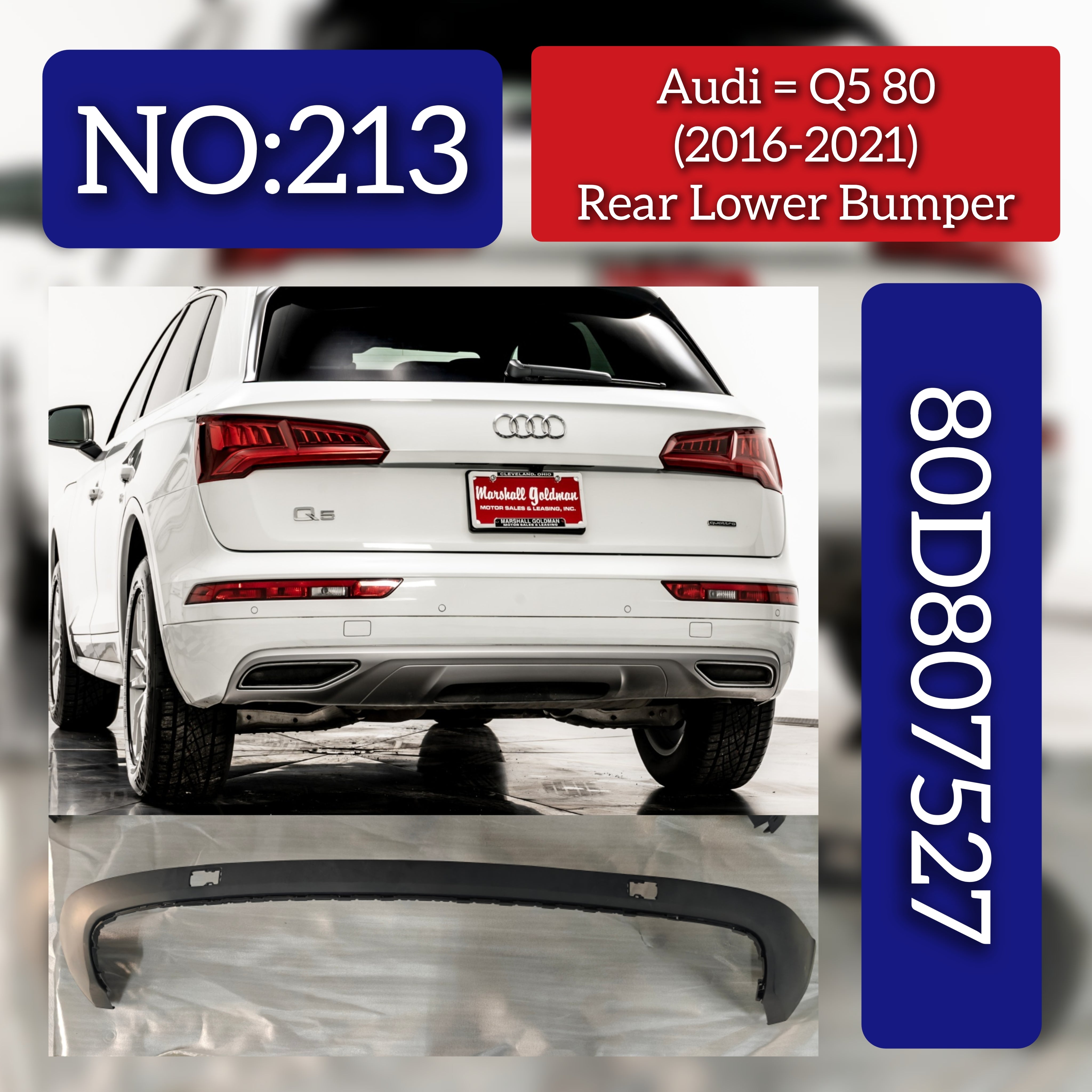 The Rear Lower Bumper 80D807527 is designed for AUDI Q5 models from 2018 to 2020, ensuring an exact fit and seamless integration. Manufactured to meet OEM standards, this bumper offers robust protection for the vehicle’s rear lower section while preserving its original appearance. Tag No.213 confirms its authenticity, making it an ideal choice for professional repairs or replacements to maintain your Q5’s safety and style.