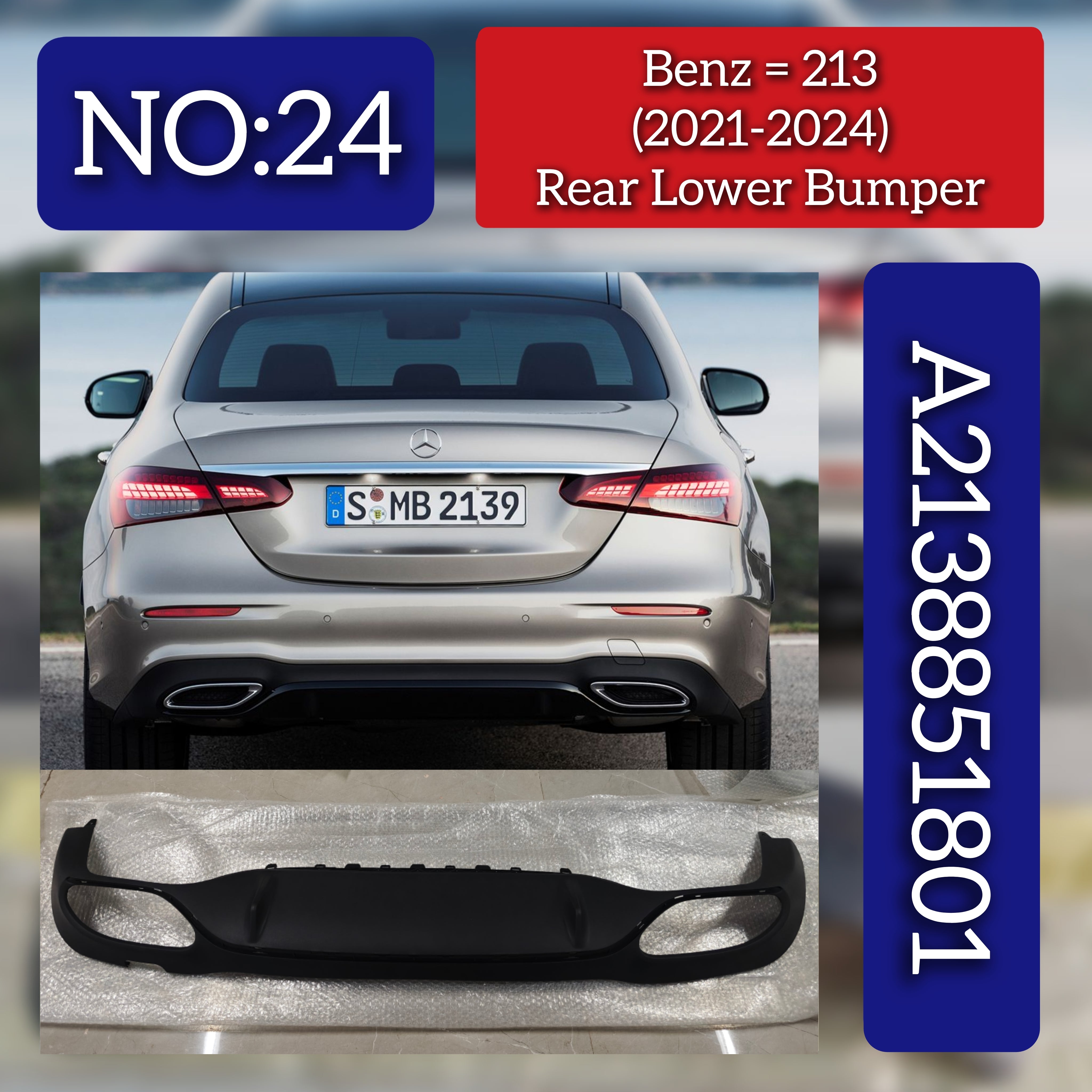 Enhance the rear protection and aesthetics of your Mercedes-Benz E-CLASS W213 (2021-2024) with this Rear Lower Upper Bumper, part number 2138851801. Designed for precise compatibility, it ensures a perfect fit and maintains the vehicle's original structural integrity. Crafted to meet OEM standards, this bumper component offers reliable durability and seamless integration, making it an essential replacement part for maintaining your vehicle’s performance and appearance. Tag No.24.