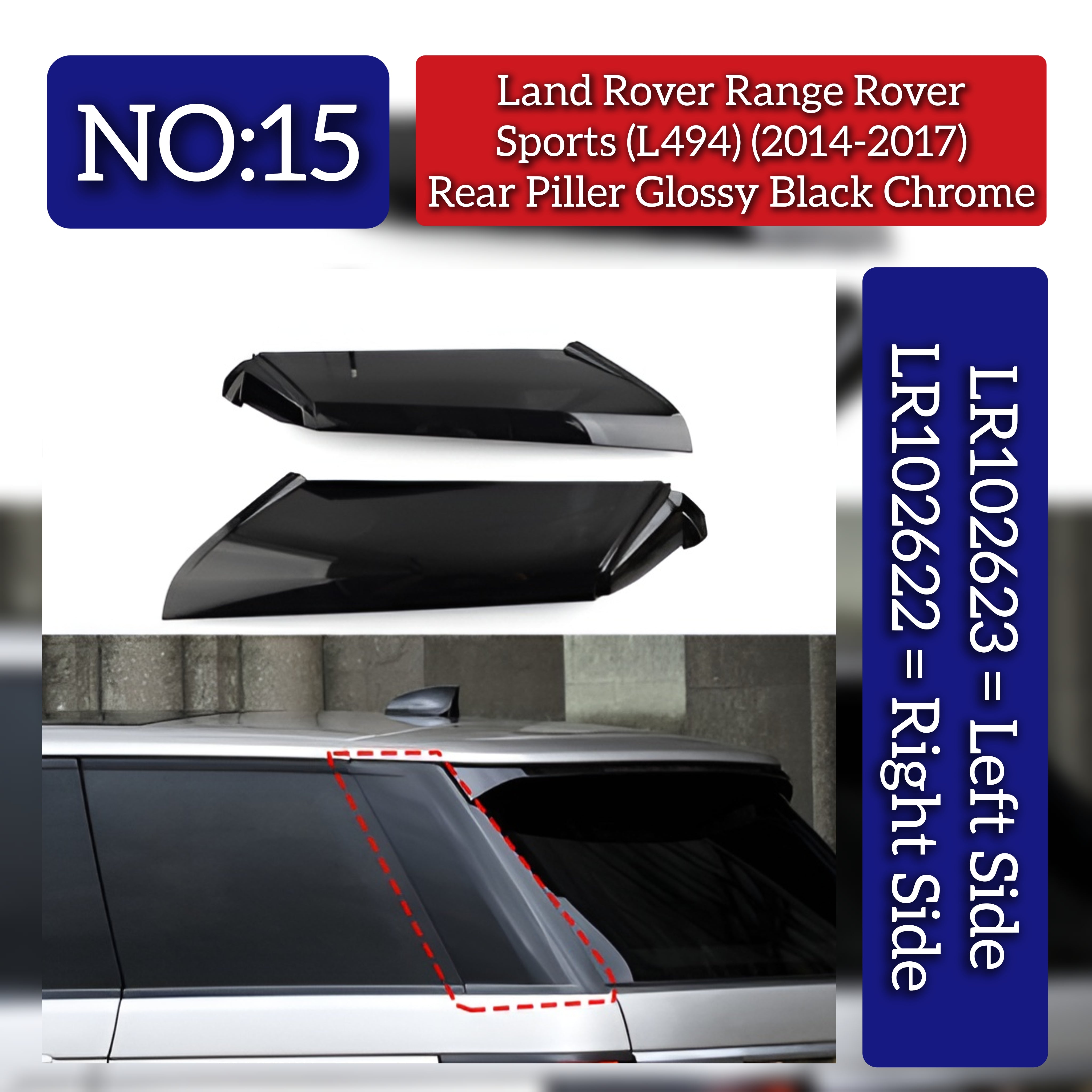 These rear pillar chrome trims, LR102622 for the right side and LR102623 for the left, are designed specifically for the Land Rover Range Rover Sport L494 model years 2014 to 2017. Crafted to match the original factory specifications, they provide a precise fit and enhance the vehicle’s exterior with a sleek, durable chrome finish. Ideal for professional installation, these parts help maintain the premium aesthetic and value of your Range Rover while protecting the pillar area from wear and damage.