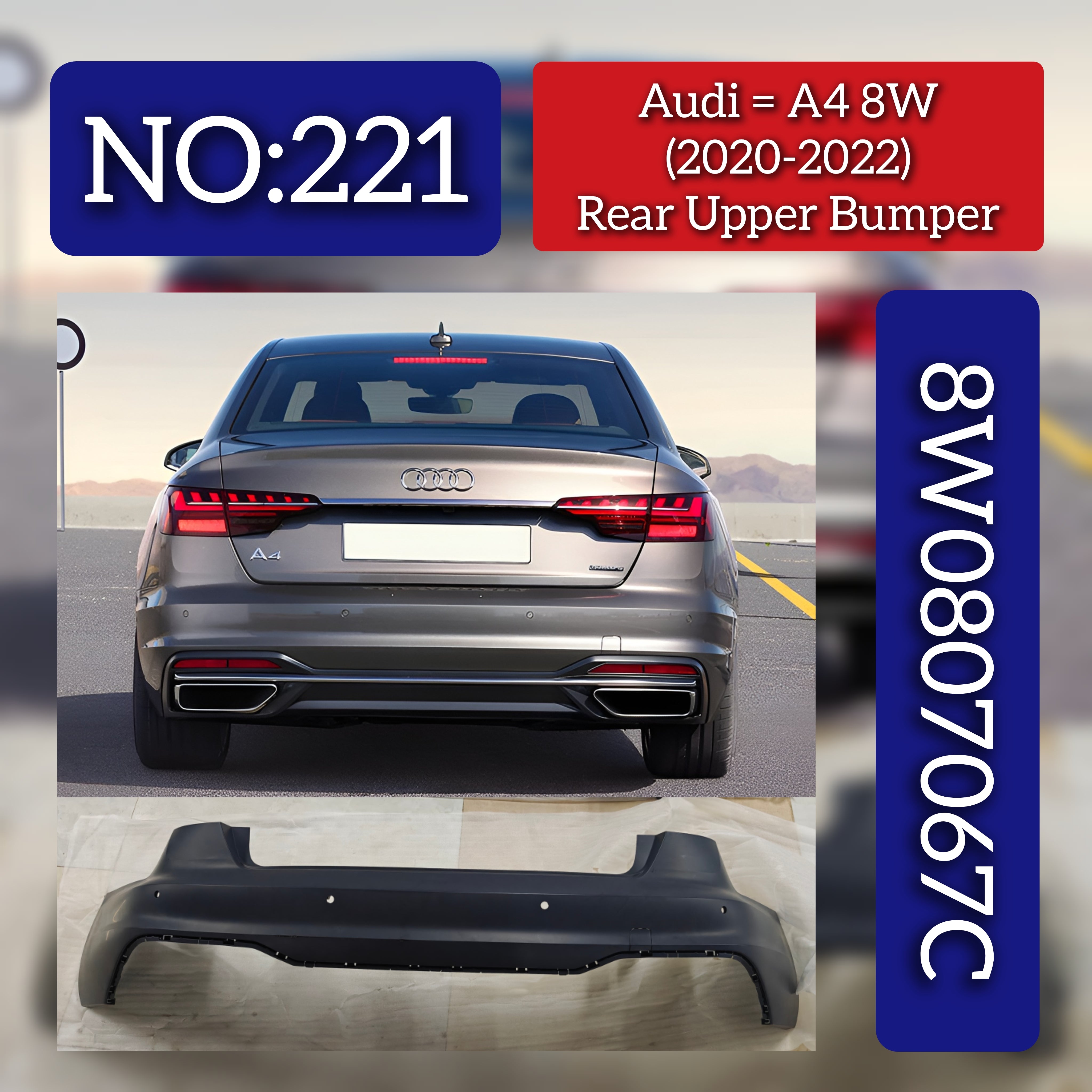 This Rear Upper Bumper (part numbers 8W0807067C, 8WD807067C) is designed specifically for the AUDI A4 (8W) models from 2020 to 2022. Engineered for a precise fit, it ensures optimal protection and maintains the vehicle's original aesthetic. Manufactured from durable materials, this component provides reliable impact absorption while preserving the structural integrity of your vehicle's rear end. Ideal for professional repairs or upgrades, it helps restore your AUDI A4 to its factory condition with confidence.