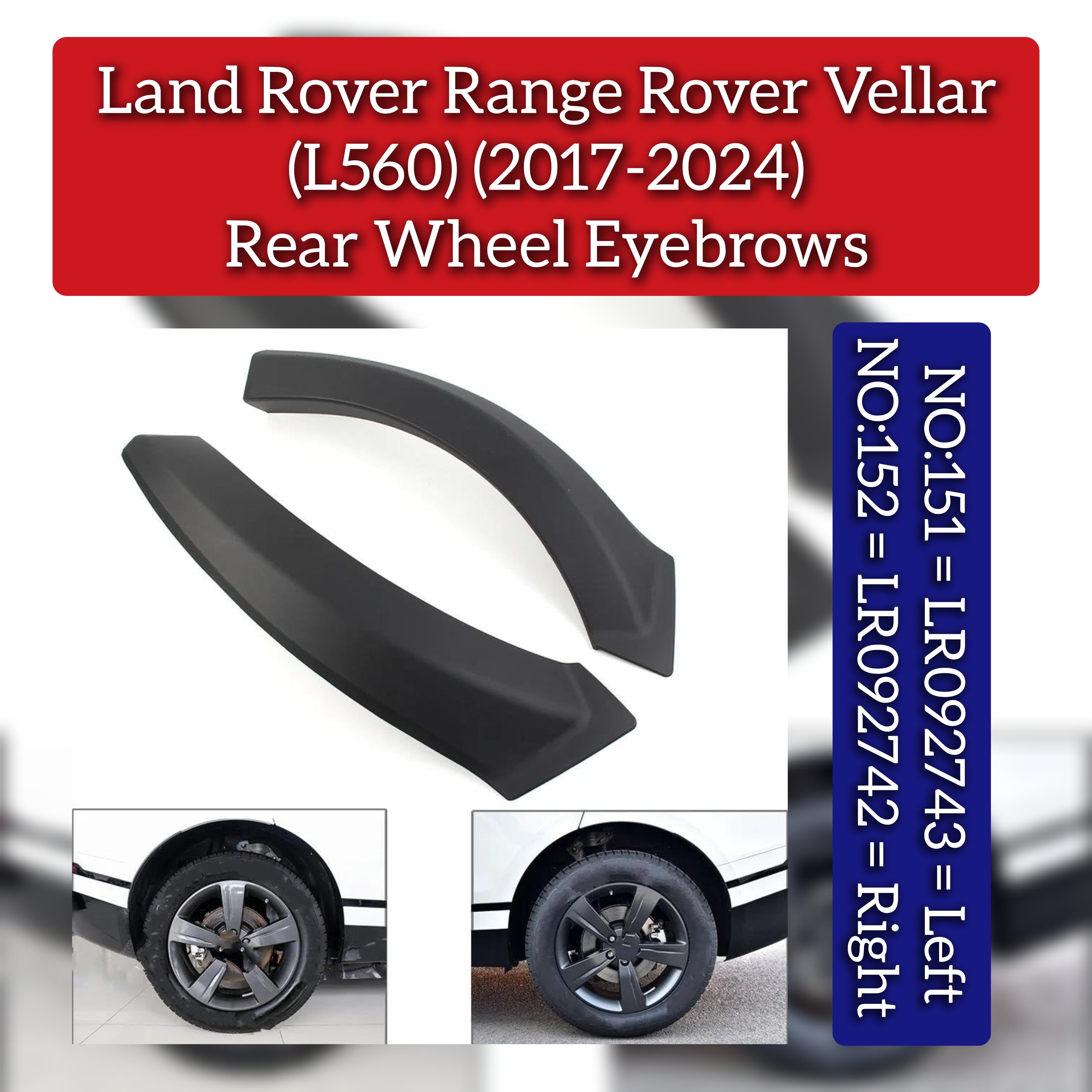 Enhance the durability and appearance of your Land Rover Range Rover Velar (2017-2024) with these genuine Rear Wheel Eyebrows—Right (LR092742) and Left (LR092743). Designed to fit perfectly on model L560, they protect your vehicle’s rear wheel arches from debris and wear while maintaining the original styling. Precision-engineered for easy installation and lasting performance, these parts ensure your Range Rover Velar stays in optimal condition. Suitable for tags 151 and 152, they provide reliable replacement components for your premium SUV.