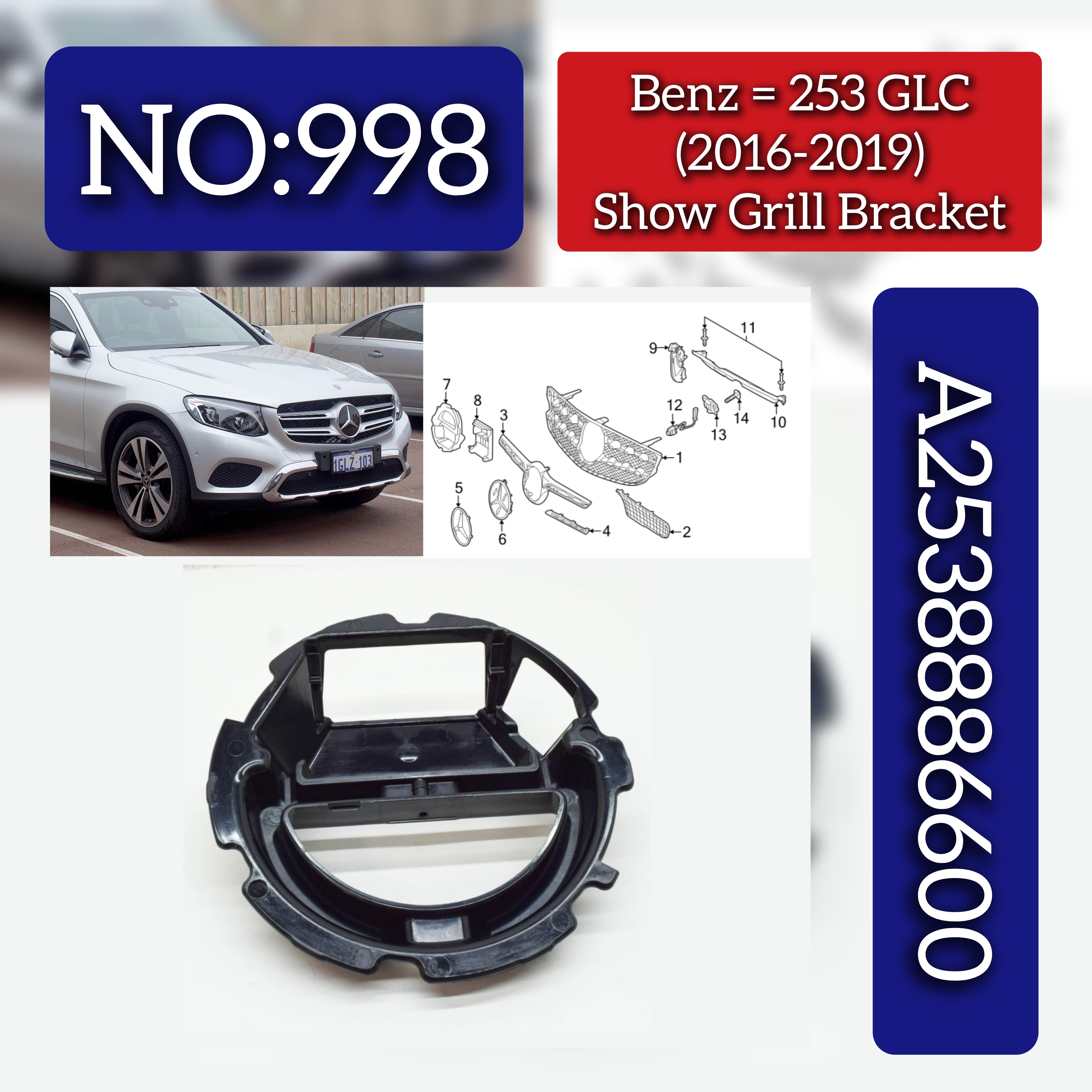 The Show Grill Bracket A2538886600 is a precise replacement part compatible with Mercedes Benz 253-GLC models from 2016 to 2019. Designed to meet OEM standards, this bracket ensures a secure and accurate mounting of the front grill, preserving the vehicle's structural alignment and appearance. Manufactured for durability, it guarantees reliable performance and maintains optimal airflow to the engine. Identified by Tag No.998, this component is essential for maintaining the integrity and fitment of your Mercedes Benz grill assembly.