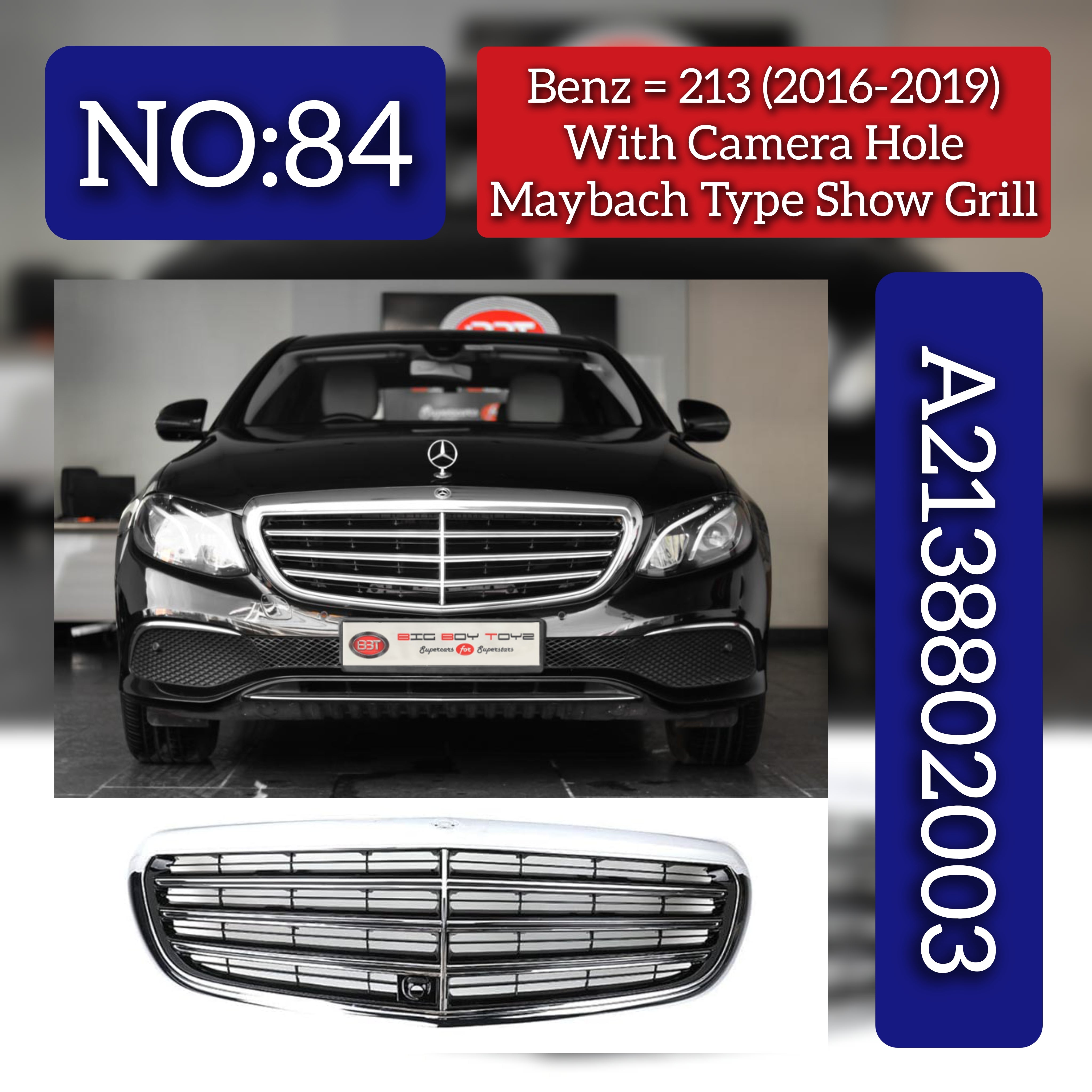 This Show Grill with Camera Hole (Brkn) 2138802003 is precisely engineered for Mercedes-Benz E-CLASS W213 models from 2016 to 2019. It features an integrated camera hole to accommodate the original front camera, ensuring seamless installation and maintaining the vehicle’s advanced driver-assistance systems. Manufactured to meet OEM standards, this grill offers durability and a perfect fit, preserving both the aesthetic and functional integrity of your E-CLASS. Tag No.84 confirms its exact compatibility for reliable replacement.