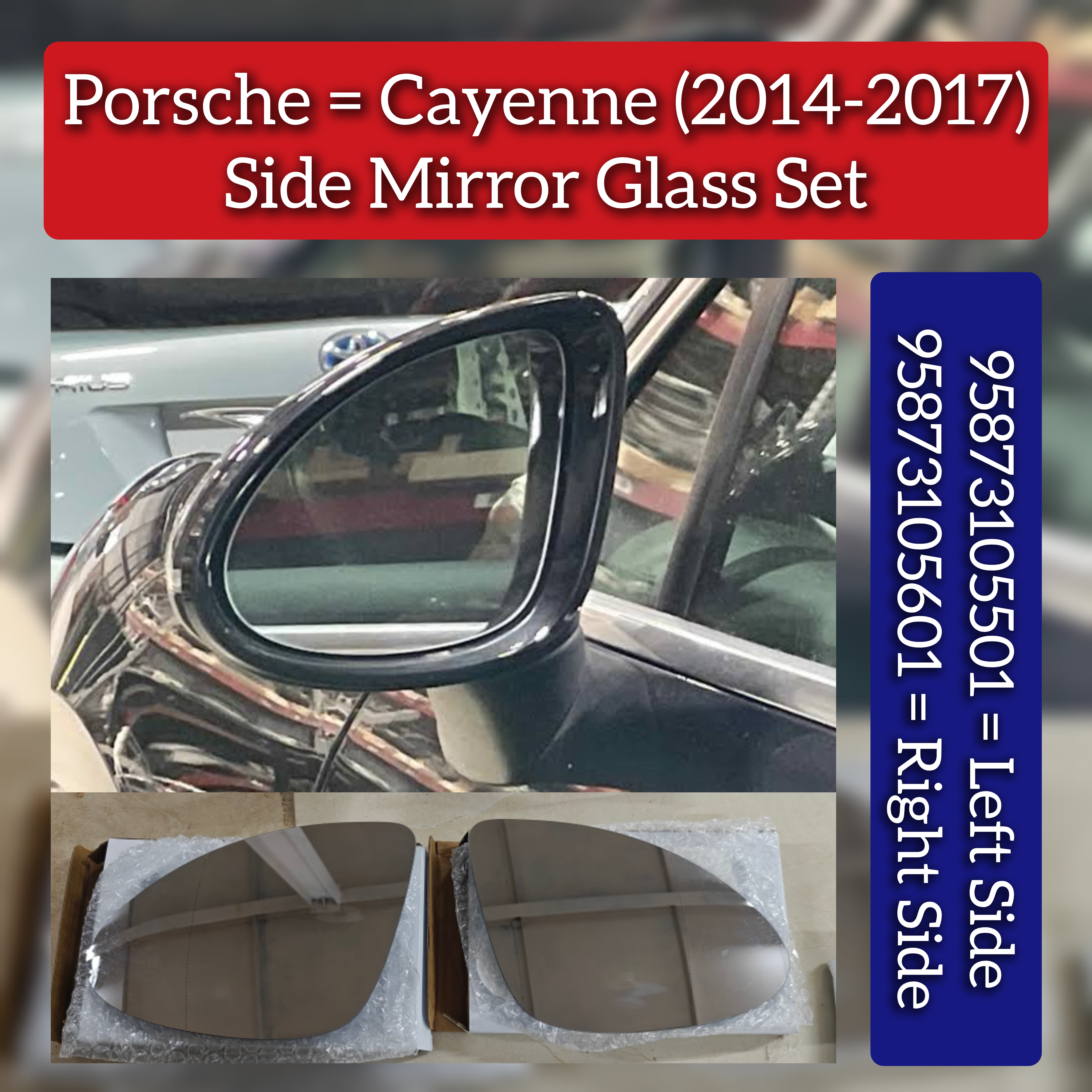 Enhance your Porsche Cayenne's safety and visibility with this genuine replacement side mirror glass set, specifically designed for model years 2014 to 2017. The left (95873105501) and right (95873105601) mirror glasses fit precisely, ensuring optimal rear and side views. Crafted to match original specifications, they maintain your vehicle’s aesthetics and functionality while restoring clear, distortion-free reflections for confident driving.