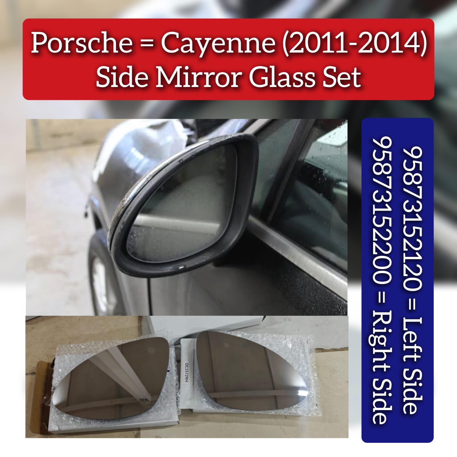 Upgrade your car's safety and style with our Side Mirror Glass Left 95873152120 & Right 95873152220. Designed for PORSCHE & CAYENNE models, these high-quality glass mirrors provide optimal visibility while driving. Protect your investment and enhance your driving experience with our compatible side mirror glass.