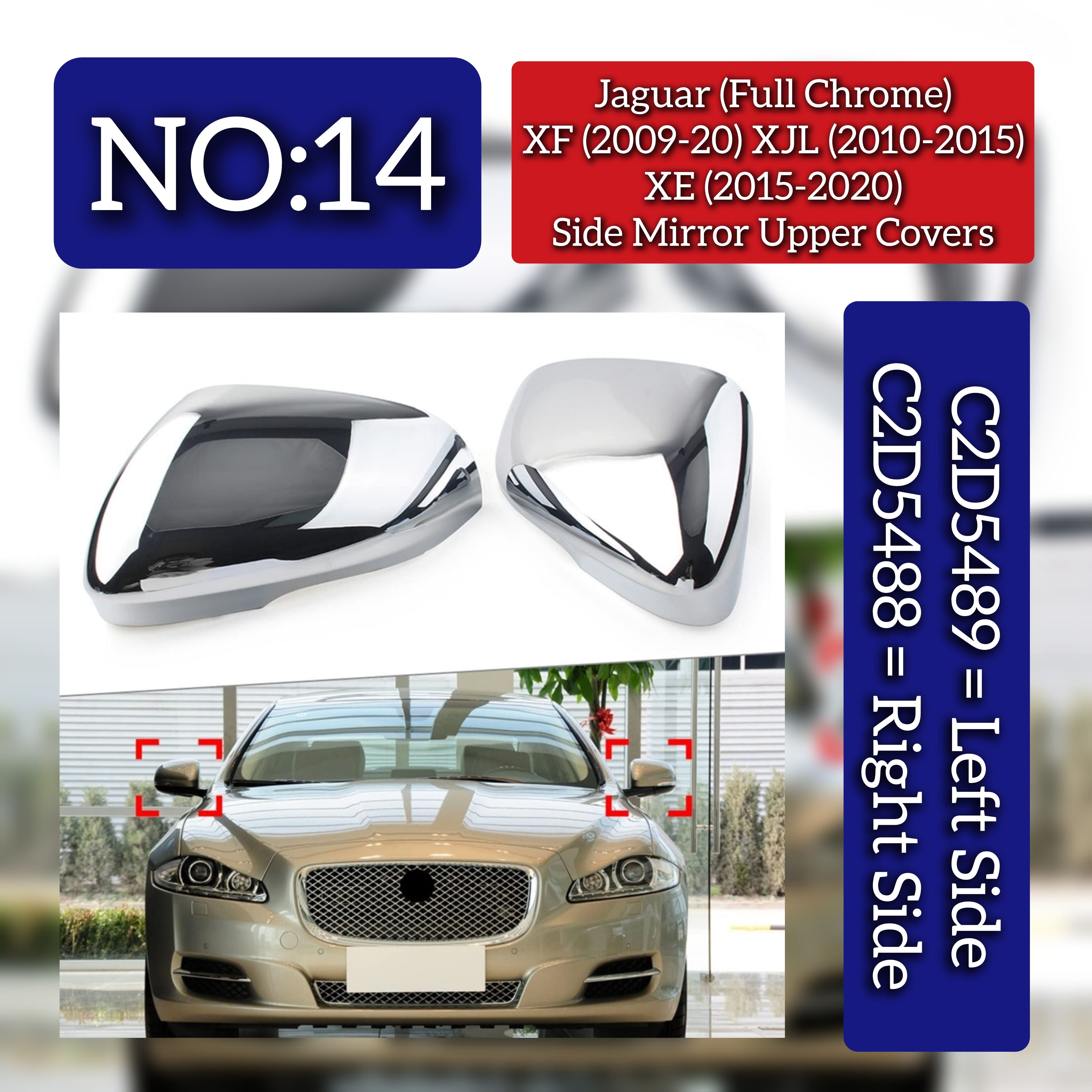 Enhance your Jaguar's mirror assembly with these precision-engineered side mirror upper covers, designed for optimal fitment and durability. Featuring full chrome construction, this left-right pair delivers a refined, reflective finish that complements your vehicle's luxury aesthetic while safeguarding mirror housings from environmental exposure. Engineered specifically for XF (2009-2020), XJL (2010-2015), and XE (2015-2020) models, these covers integrate seamlessly without requiring modifications. Part numbers C2D5489 (left) and C2D5488 (right) ensure correct application, providing both visual refinement and protective functionality for long-lasting performance.