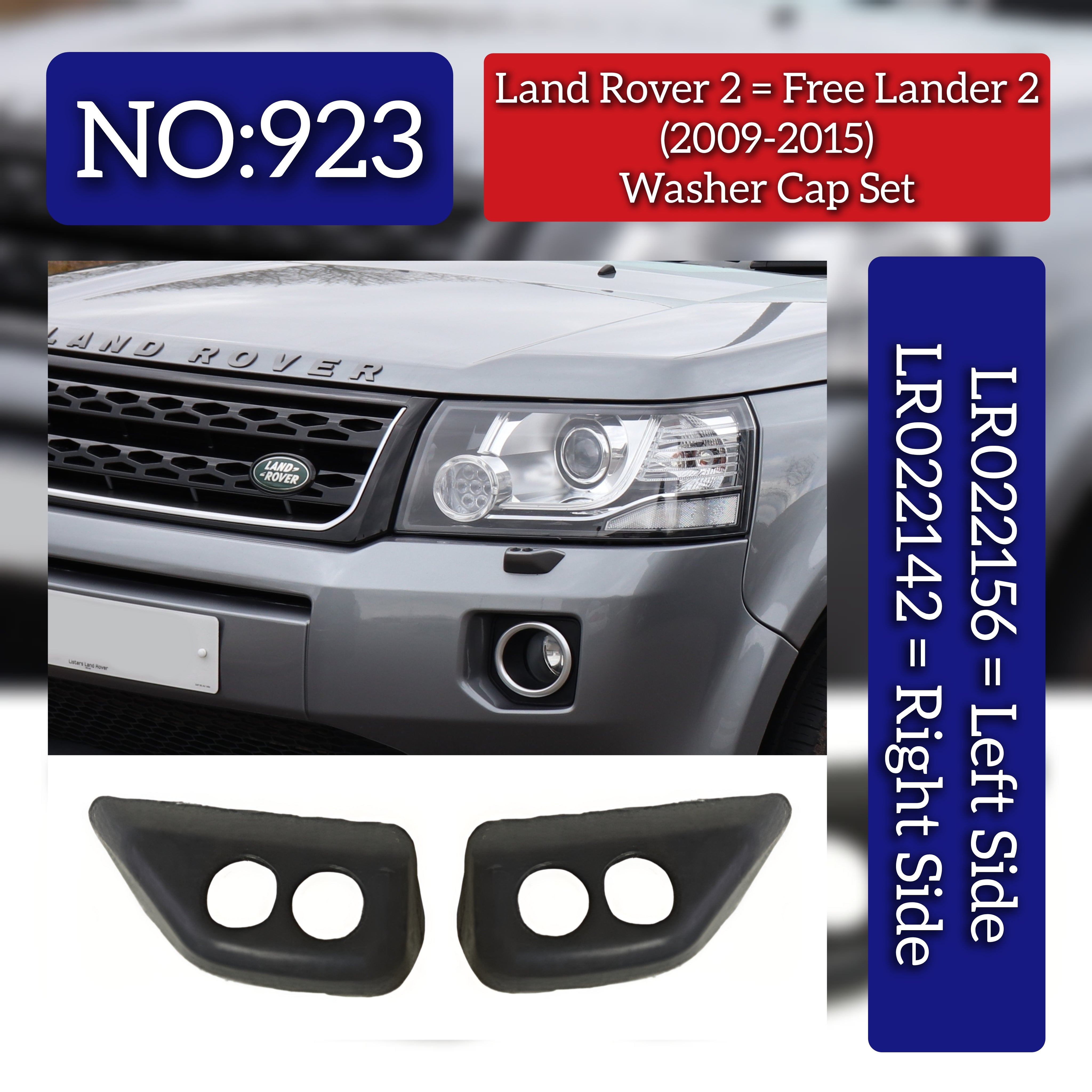 This Washer Cap Set, including Left LR022156 and Right LR022142, is designed specifically for Range Rover 2 and Free Lander 2 - L359 models from 2009 to 2015. Engineered for precise fitment, these caps ensure reliable sealing and protection of the washer fluid system, maintaining optimal performance and preventing leaks. Ideal for professional repairs or maintenance, this set helps preserve your vehicle’s functionality and appearance with durable, OEM-compatible components.